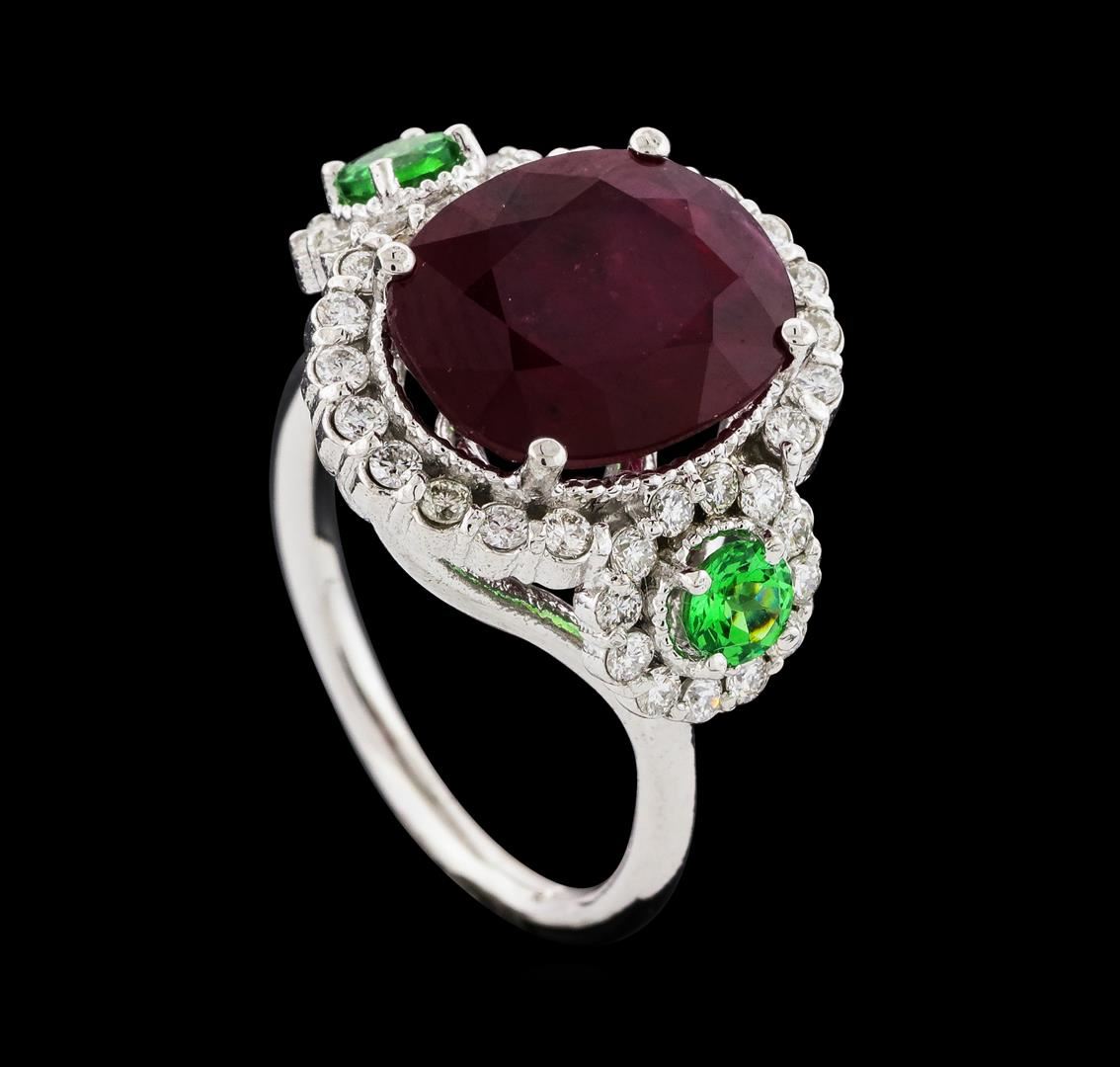 One Ruby, Tsavorite, and Diamond Ring featuring: 14KT White Gold with a total weight of 5.40 grams, Ruby with a total weight of 5.91ct, Tsavorite with a total weight of 0.44ctw, and 40 Diamonds with a total weight of 0.61ctw.