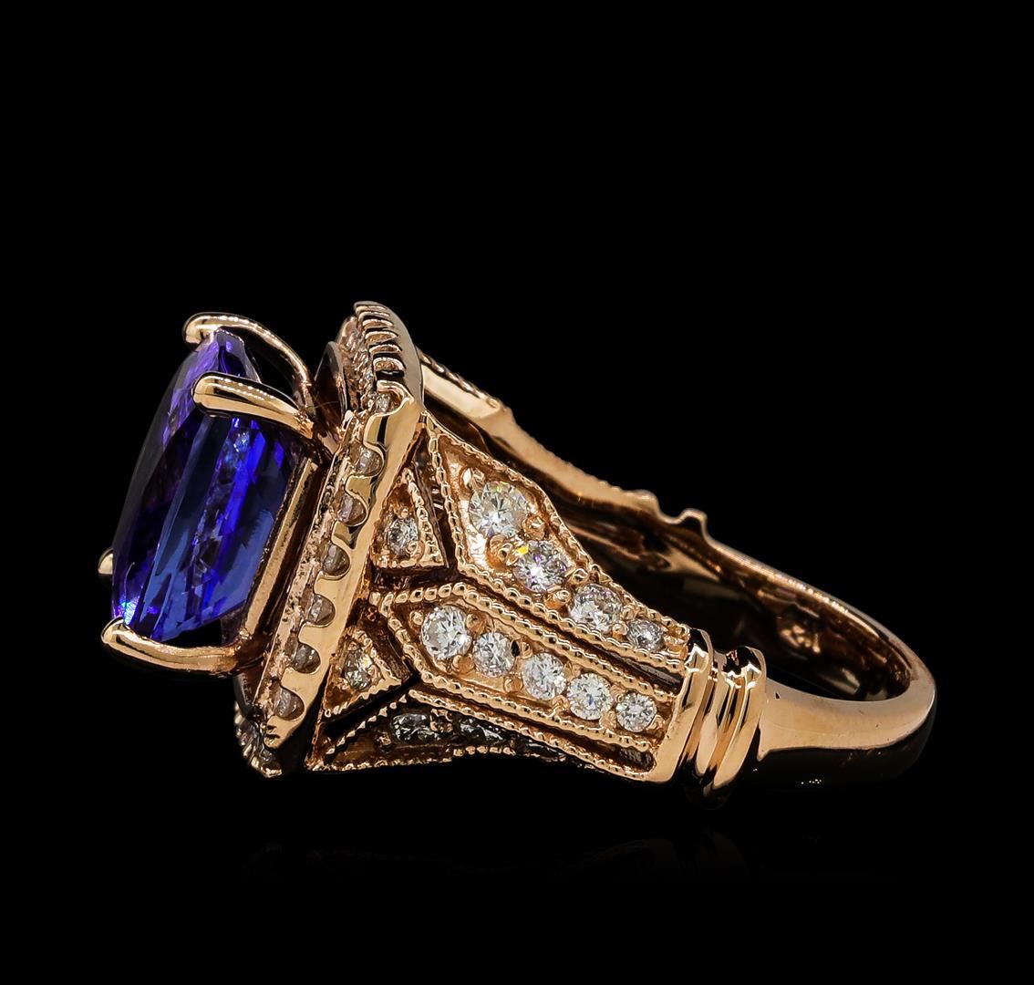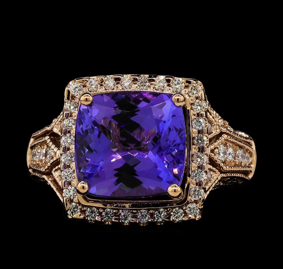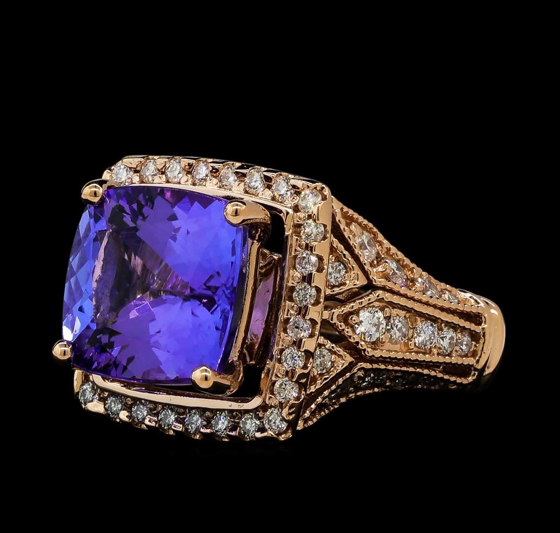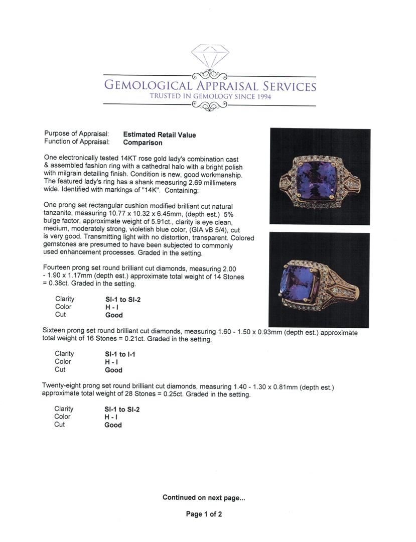 One electronically tested 14KT rose gold lady's combination cast & assembled fashion ring with a cathedral halo with a bright polish with milgrain detailing finish. The featured lady's ring has a shank measuring 2.69 millimeters wide. Identified with markings of '14K'. Condition is new, good workmanship. Containing: One prong set rectangular cushion modified brilliant cut natural tanzanite, measuring 10.77 x 10.32 x 6.45mm, (depth est.) 5%. bulge factor, approximate weight of 5.91ct., clarity is eye clean, medium, moderately strong, violetish blue color, (GIA vB 5/4), cut is very good. Transmitting light with no distortion, transparent. Colored gemstones are presumed to have been subjected to commonly used enhancement processes. Graded in the setting. Fourteen prong set round brilliant cut diamonds, measuring 2.00 - 1.90 x 1.17mm (depth est.) approximate total weight of 14 Stones = 0.38ct. Graded in the setting. Clarity SI-1 to SI-2. Color: H - I Cut Good Sixteen prong set round brilliant cut diamonds, measuring 1.60 - 1.50 x 0.93mm (depth est.) approximate total weight of 16 Stones = 0.21ct. Graded in the setting. Clarity SI-1 to I-1. Color: H - I Cut Good Twenty-Eight prong set round brilliant cut diamonds, measuring 1.40 - 1.30 x 0.81mm (depth est.) approximate total weight of 28 Stones = 0.25ct. Graded in the setting. Clarity SI-1 to SI-2. Color: H - I Cut Good. Total Weight of Colored Stones 5.91ct.. Total Weight of Diamonds 0.84ct.. Total Weight of Ring 8.60gm. GAS Appraised at $12,920.00.