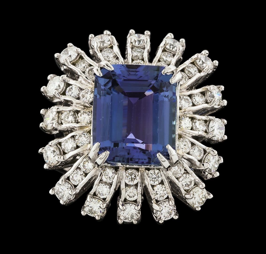 One electronically tested 14KT white gold lady's cast fashion ring with a triple basket halo with a bright polish finish. The featured lady's ring has a shank measuring 2.66 millimeters wide. Identified with markings of 'K14'. Condition is new, good workmanship. Containing: One prong set emerald standard step cut natural tanzanite, measuring 11.74 x 9.63 x 5.85mm, (depth est.) approximate weight of 5.91ct., clarity is eye clean, medium light, moderately strong, violetish blue color, (GIA vB 4/4), cut is good. Transmitting light with no distortion, transparent. Colored gemstones are presumed to have been subjected to commonly used enhancement processes. Graded in the setting. Sixteen prong set round brilliant cut diamonds, measuring 2.60 - 2.50 x 1.58mm (depth est.) approximate total weight of 16 Stones = 1.00ct. Graded in the setting. Clarity SI-1 to SI-2. Color: H - I Cut Good Thirty-Two channel set round brilliant cut diamonds, measuring 1.90 - 1.85 x 1.17mm (depth est.) approximate total weight of 32 Stones = 0.80ct. Graded in the setting. Clarity SI-1 to SI-3. Color: H - I Cut Good. Total Weight of Colored Stones 5.91ct.. Total Weight of Diamonds 1.80ct.. Total Weight of Ring 8.80gm. GAS Appraised at $12,225.00.