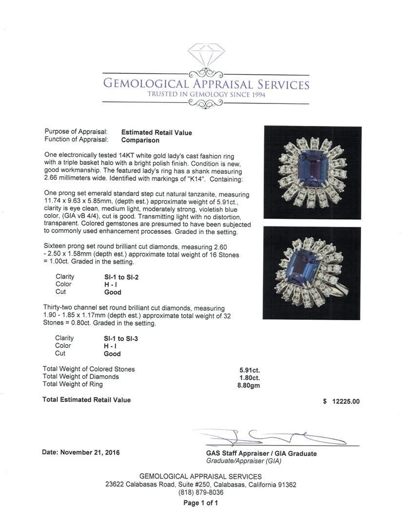 One electronically tested 14KT white gold lady's cast fashion ring with a triple basket halo with a bright polish finish. The featured lady's ring has a shank measuring 2.66 millimeters wide. Identified with markings of 'K14'. Condition is new, good workmanship. Containing: One prong set emerald standard step cut natural tanzanite, measuring 11.74 x 9.63 x 5.85mm, (depth est.) approximate weight of 5.91ct., clarity is eye clean, medium light, moderately strong, violetish blue color, (GIA vB 4/4), cut is good. Transmitting light with no distortion, transparent. Colored gemstones are presumed to have been subjected to commonly used enhancement processes. Graded in the setting. Sixteen prong set round brilliant cut diamonds, measuring 2.60 - 2.50 x 1.58mm (depth est.) approximate total weight of 16 Stones = 1.00 ct. Graded in the setting. Clarity SI-1 to SI-2. Color: H - I Cut Good Thirty-Two channel set round brilliant cut diamonds, measuring 1.90 - 1.85 x 1.17mm (depth est.) approximate total weight of 32 Stones = 0.80 ct. Graded in the setting. Clarity SI-1 to SI-3. Color: H - I Cut Good. Total Weight of Colored Stones 5.91ct.. Total Weight of Diamonds 1.80 ct.. Total Weight of Ring 8.80gm. GAS Appraised.