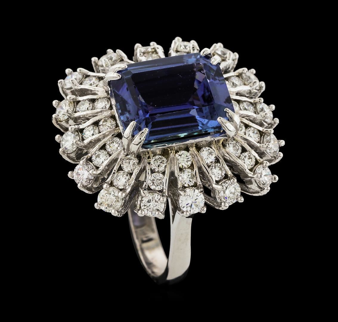 One electronically tested 14KT white gold lady's cast fashion ring with a triple basket halo with a bright polish finish. The featured lady's ring has a shank measuring 2.66 millimeters wide. Identified with markings of 'K14'. Condition is new, good workmanship. Containing: One prong set emerald standard step cut natural tanzanite, measuring 11.74 x 9.63 x 5.85mm, (depth est.) approximate weight of 5.91ct., clarity is eye clean, medium light, moderately strong, violetish blue color, (GIA vB 4/4), cut is good. Transmitting light with no distortion, transparent. Colored gemstones are presumed to have been subjected to commonly used enhancement processes. Graded in the setting. Sixteen prong set round brilliant cut diamonds, measuring 2.60 - 2.50 x 1.58mm (depth est.) approximate total weight of 16 Stones = 1.00 ct. Graded in the setting. Clarity SI-1 to SI-2. Color: H - I Cut Good Thirty-Two channel set round brilliant cut diamonds, measuring 1.90 - 1.85 x 1.17mm (depth est.) approximate total weight of 32 Stones = 0.80 ct. Graded in the setting. Clarity SI-1 to SI-3. Color: H - I Cut Good. Total Weight of Colored Stones 5.91ct.. Total Weight of Diamonds 1.80 ct.. Total Weight of Ring 8.80gm. GAS Appraised.