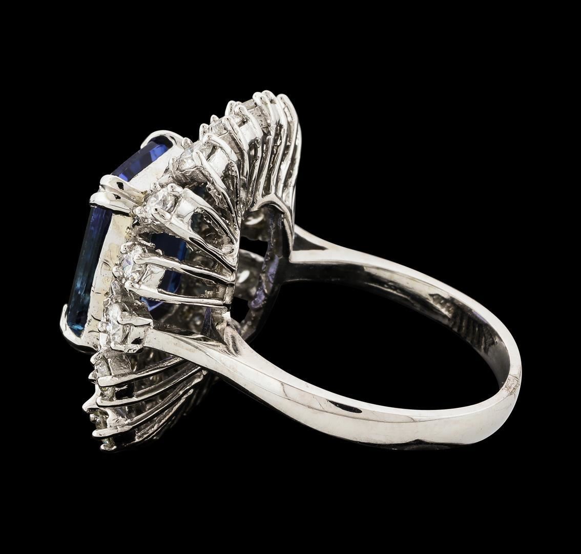 One electronically tested 14KT white gold lady's cast fashion ring with a triple basket halo with a bright polish finish. The featured lady's ring has a shank measuring 2.66 millimeters wide. Identified with markings of 'K14'. Condition is new, good workmanship. Containing: One prong set emerald standard step cut natural tanzanite, measuring 11.74 x 9.63 x 5.85mm, (depth est.) approximate weight of 5.91ct., clarity is eye clean, medium light, moderately strong, violetish blue color, (GIA vB 4/4), cut is good. Transmitting light with no distortion, transparent. Colored gemstones are presumed to have been subjected to commonly used enhancement processes. Graded in the setting. Sixteen prong set round brilliant cut diamonds, measuring 2.60 - 2.50 x 1.58mm (depth est.) approximate total weight of 16 Stones = 1.00 ct. Graded in the setting. Clarity SI-1 to SI-2. Color: H - I Cut Good Thirty-Two channel set round brilliant cut diamonds, measuring 1.90 - 1.85 x 1.17mm (depth est.) approximate total weight of 32 Stones = 0.80 ct. Graded in the setting. Clarity SI-1 to SI-3. Color: H - I Cut Good. Total Weight of Colored Stones 5.91ct.. Total Weight of Diamonds 1.80 ct.. Total Weight of Ring 8.80gm. GAS Appraised.