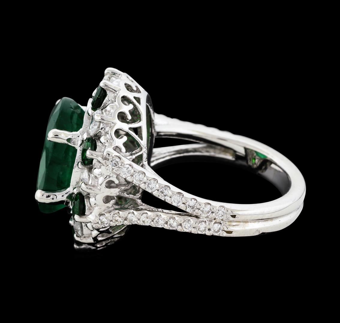 One electronically tested 14KT white gold lady's cast fashion ring with a split shank basket halo with a bright polish finish. The featured lady's ring has a double shank measuring 3.47 millimeters wide. Identified with markings of '14K'. Condition is new, good workmanship. Containing: One prong set oval modified mixed cut natural emerald, measuring 12.80 x 9.85 x 5.64mm, (depth est.) 15%. bulge factor, approximate weight of 5.00ct., clarity is heavily included, medium dark, moderately strong, green color, (GIA G 6/4), cut is good. Transmitting light somewhat diffusely, semi-transparent to translucent. Naturally occurring internal & external characteristics are present. Indications of oil residue. Colored gemstones are presumed to have been subjected to commonly used enhancement processes. Graded in the setting. Seven prong set round modified brilliant cut natural tsavorite garnets, measuring 3.05 - 2.95 x 1.95 mm, (depth est.) approximate total weight of 0.92ct., clarity is eye clean, medium dark, moderately strong, slightly yellowish green color, (GIA slyG 6/4), cut is good. Transmitting light with no distortion, transparent. Colored gemstones are presumed to have been subjected to commonly used enhancement processes. Graded in the setting. Seven prong set round brilliant cut diamonds, measuring 3.00 - 2.90 x 1.80mm (depth est.) approximate total weight of 7 Stones = 0.67ct. Graded in the setting. Clarity SI-2 to I-1. Color: G - H Cut Good Thirty-Six prong set round brilliant cut diamonds, measuring 1.40 - 1.35 x 0.86mm (depth est.) approximate total weight of 36 Stones = 0.36ct. Graded in the setting. Clarity SI-1 to SI-2. Color: H - I Cut Good. Total Weight of Colored Stones 5.92ct.. Total Weight of Diamonds 1.03ct.. Total Weight of Ring 9.60gm. GAS Appraised at $8,635.00.