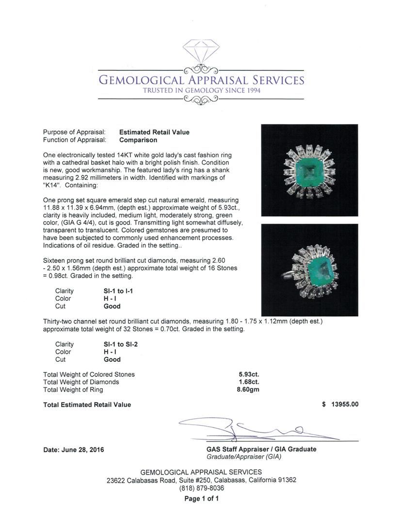 One electronically tested 14KT white gold lady's cast fashion ring with a cathedral basket halo with a bright polish finish. The featured lady's ring has a shank measuring 2.92 millimeters in width. Identified with markings of "K14". Condition is new, good workmanship. Containing: One prong set square emerald step cut natural emerald, measuring 11.88 x 11.39 x 6.94mm, (depth est.) approximate weight of 5.93ct., clarity is heavily included, medium light, moderately strong, green color, (GIA G 4/4), cut is good. Transmitting light somewhat diffusely, transparent to translucent. Colored gemstones are presumed to have been subjected to commonly used enhancement processes. Indications of oil residue. Graded in the setting. Sixteen prong set round brilliant cut diamonds, measuring 2.60 - 2.50 x 1.56mm (depth est.) approximate total weight of 16 Stones = 0.98ct. Graded in the setting. Clarity: SI-1 to I-1. Color: H - I. Cut Good Thirty-Two channel set round brilliant cut diamonds, measuring 1.80 - 1.75 x 1.12mm (depth est.) approximate total weight of 32 Stones = 0.70ct. Graded in the setting. Clarity: SI-1 to SI-2. Color: H - I. Cut Good. Total Weight of Colored Stones 5.93ct. Total Weight of Diamonds 1.68ct. Total Weight of Ring 8.60gm. GAS Appraised at $13,955.00.