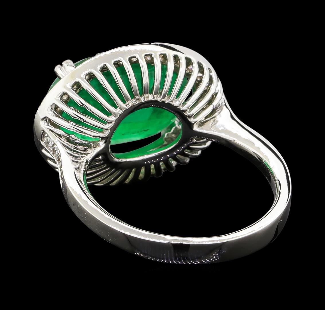 One electronically tested 14KT white gold lady's cast fashion ring with a basket halo with a bright polish with milgrain detailing finish. The featured lady's ring has a shank measuring 2.63 millimeters wide. Identified with markings of '14K'. Condition is new, good workmanship. Containing: One prong set oval modified mixed cut natural emerald, measuring 9.91 x 14.10 x 6.09mm, (depth est.) 20%. bulge factor, approximate weight of 5.95ct., clarity is severely included, medium dark, moderately strong, green color, (GIA G 6/4), cut is good. Transmitting light somewhat diffusely, semi-transparent to translucent. Naturally occurring internal & external characteristics are present. Indications of oil residue. Colored gemstones are presumed to have been subjected to commonly used enhancement processes. Graded in the setting. Forty-Four prong set round brilliant cut diamonds, measuring 1.40 - 1.35 x 0.86mm (depth est.) approximate total weight of 44 Stones = 0.44ct. Graded in the setting. Clarity SI-1 to SI-2. Color: H - I Cut Good. Total Weight of Colored Stones 5.95ct.. Total Weight of Diamonds 0.44ct.. Total Weight of Ring 6.20gm. GAS Appraised at $8,050.00.