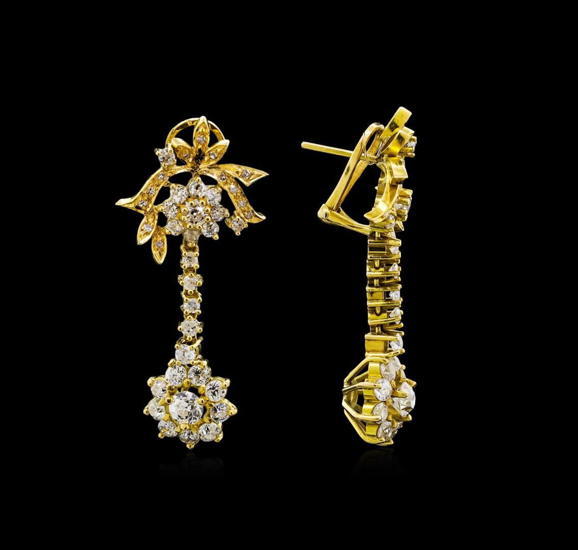 One pair electronically tested 18KT yellow gold lady's combination cast & assembled dangle flower design earrings with Omega clip backs with posts with a bright polish finish. Condition is used, good workmanship. Containing: Two prong set Old European cut diamonds, measuring 5.25 - 5.20 x 3.66mm (depth est.) approximate total weight of 2 Stones = 1.25ct. Graded in the setting. Clarity: VS-1 to VS-2. Color: F - Good Fifty prong set old mine cut diamonds, measuring 3.20 - 2.50 x 1.77mm (depth est.) approximate total weight of 50 Stones = 4.40ct. Graded in the setting. Clarity: VS-1 to I-1. Color: F - I. Cut Fair Twenty-Six bead set single cut diamonds, measuring 1.50 - 1.40 x 0.87mm (depth est.) approximate total weight of 26 Stones = 0.30ct. Graded in the setting. Clarity: SI-1 to I-1. Color: G - I. Cut Good. Total Weight of Diamonds 5.95ct. Total Weight of Earrings 17.50gm. GAS Appraised at $16,960.00.