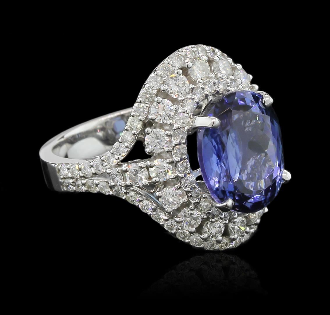 One electronically tested 14KT white gold lady's cast fashion ring with a bright polish finish. The featured lady's ring has a 3.70 millimeter wide shank. Identified with markings of "K14". Condition is new, good workmanship. Containing: One prong set oval mixed cut natural tanzanite, measuring 11.69 x 9.56 x 6.40mm, 18% bulge factor, approximate weight of 5.96ct., clarity is eye clean, type I, medium dark, moderately strong, bluish violet color, (GIA bV 6/4), cut is very good. Colored gemstones are presumed to have been subjected to commonly used enhancement processes. Graded in the setting. Seventy-Eight shared prong set round brilliant cut diamonds, measuring 1.45 - 1.40 x 0.89mm (depth est.) approximate total weight of 78 Stones = 0.87ct. Graded in the setting. Clarity: SI-1 to I-1. Color: H - I. Cut Good Eighteen prong set round brilliant cut diamonds, measuring 2.30 - 2.25 x 1.48mm (depth est.) approximate total weight of 18 Stones = 0.86ct. Graded in the setting. Clarity: SI-1 to SI-2. Color: H - I. Cut Good Two prong set round brilliant cut diamonds, measuring 1.55 - 1.55 x 1.01mm (depth est.) approximate total weight of 2 Stones = 0.03ct. Graded in the setting. Clarity: SI-1 to SI-2. Color: H - I. Cut Good. Total Weight of Colored Stones 5.96ct. Total Weight of Diamonds 1.76ct. Total Weight of Ring 8.90gm. GAS Appraised at $13,985.00.
