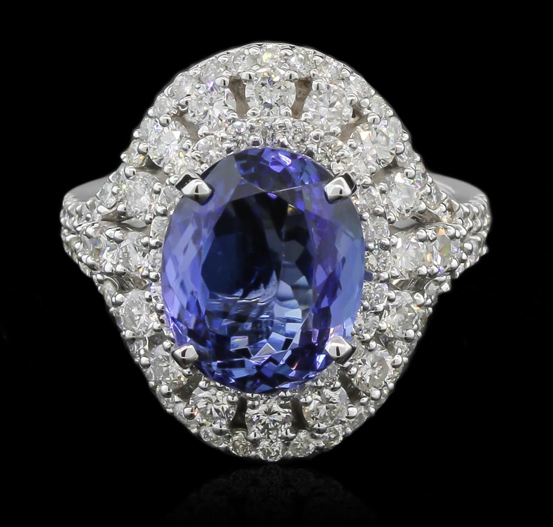 One electronically tested 14KT white gold lady's cast fashion ring with a bright polish finish. The featured lady's ring has a 3.70 millimeter wide shank. Identified with markings of "K14". Condition is new, good workmanship. Containing: One prong set oval mixed cut natural tanzanite, measuring 11.69 x 9.56 x 6.40mm, 18% bulge factor, approximate weight of 5.96ct., clarity is eye clean, type I, medium dark, moderately strong, bluish violet color, (GIA bV 6/4), cut is very good. Colored gemstones are presumed to have been subjected to commonly used enhancement processes. Graded in the setting. Seventy-Eight shared prong set round brilliant cut diamonds, measuring 1.45 - 1.40 x 0.89mm (depth est.) approximate total weight of 78 Stones = 0.87ct. Graded in the setting. Clarity: SI-1 to I-1. Color: H - I. Cut Good Eighteen prong set round brilliant cut diamonds, measuring 2.30 - 2.25 x 1.48mm (depth est.) approximate total weight of 18 Stones = 0.86ct. Graded in the setting. Clarity: SI-1 to SI-2. Color: H - I. Cut Good Two prong set round brilliant cut diamonds, measuring 1.55 - 1.55 x 1.01mm (depth est.) approximate total weight of 2 Stones = 0.03ct. Graded in the setting. Clarity: SI-1 to SI-2. Color: H - I. Cut Good. Total Weight of Colored Stones 5.96ct. Total Weight of Diamonds 1.76ct. Total Weight of Ring 8.90gm. GAS Appraised at $13,985.00.