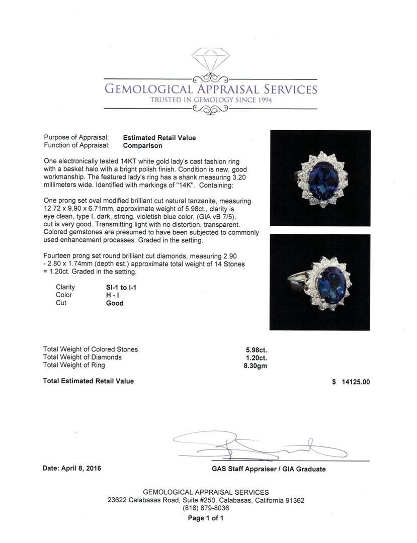 One electronically tested 14KT white gold lady's cast fashion ring with a basket halo with a bright polish finish. The featured lady's ring has a shank measuring 3.20 millimeters wide. Identified with markings of "14K". Condition is new, good workmanship. Containing: One prong set oval modified brilliant cut natural tanzanite, measuring 12.72 x 9.90 x 6.71mm, approximate weight of 5.98ct., clarity is eye clean, type I, dark, strong, violetish blue color, (GIA vB 7/5), cut is very good. Transmitting light with no distortion, transparent. Colored gemstones are presumed to have been subjected to commonly used enhancement processes. Graded in the setting. Fourteen prong set round brilliant cut diamonds, measuring 2.90 - 2.80 x 1.74mm (depth est.) approximate total weight of 14 Stones = 1.20ct. Graded in the setting. Clarity: SI-1 to I-1. Color: H - I. Cut Good. Total Weight of Colored Stones 5.98ct. Total Weight of Diamonds 1.20ct. Total Weight of Ring 8.30gm. GAS Appraised at $14,125.00.