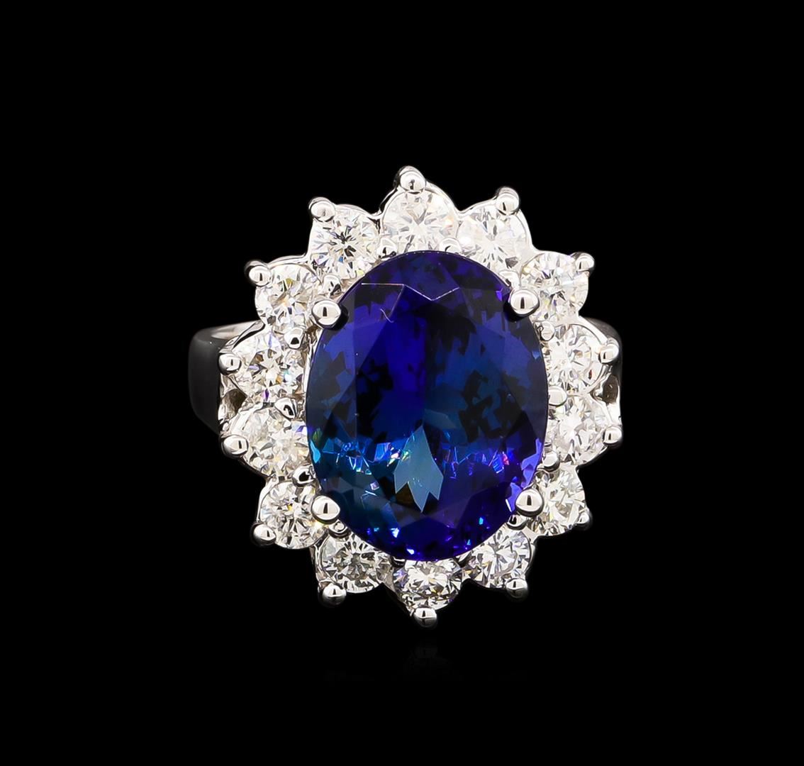 One electronically tested 14KT white gold lady's cast fashion ring with a basket halo with a bright polish finish. The featured lady's ring has a shank measuring 3.20 millimeters wide. Identified with markings of "14K". Condition is new, good workmanship. Containing: One prong set oval modified brilliant cut natural tanzanite, measuring 12.72 x 9.90 x 6.71mm, approximate weight of 5.98ct., clarity is eye clean, type I, dark, strong, violetish blue color, (GIA vB 7/5), cut is very good. Transmitting light with no distortion, transparent. Colored gemstones are presumed to have been subjected to commonly used enhancement processes. Graded in the setting. Fourteen prong set round brilliant cut diamonds, measuring 2.90 - 2.80 x 1.74mm (depth est.) approximate total weight of 14 Stones = 1.20ct. Graded in the setting. Clarity: SI-1 to I-1. Color: H - I. Cut Good. Total Weight of Colored Stones 5.98ct. Total Weight of Diamonds 1.20ct. Total Weight of Ring 8.30gm. GAS Appraised at $14,125.00.