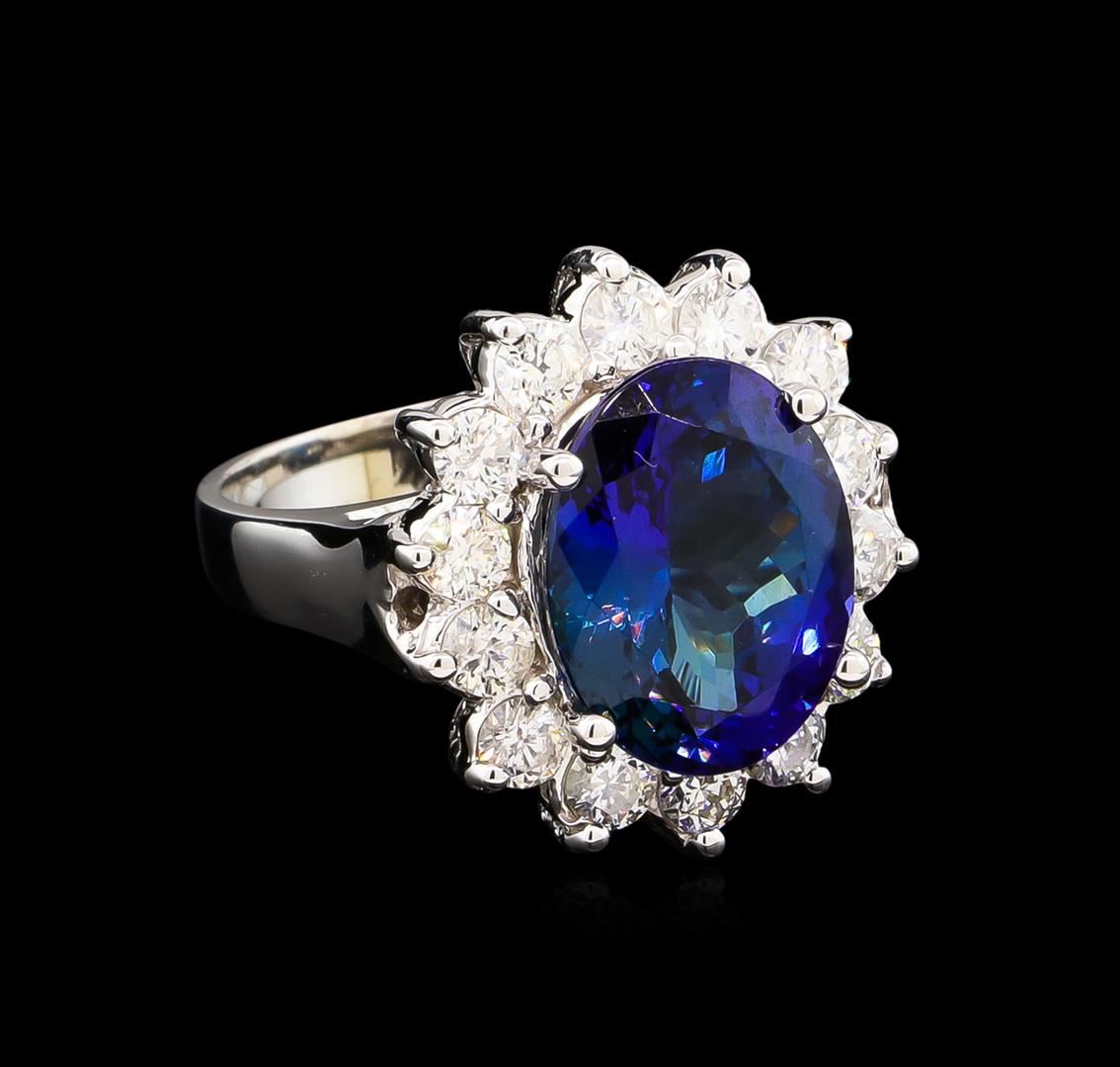 One electronically tested 14KT white gold lady's cast fashion ring with a basket halo with a bright polish finish. The featured lady's ring has a shank measuring 3.20 millimeters wide. Identified with markings of "14K". Condition is new, good workmanship. Containing: One prong set oval modified brilliant cut natural tanzanite, measuring 12.72 x 9.90 x 6.71mm, approximate weight of 5.98ct., clarity is eye clean, type I, dark, strong, violetish blue color, (GIA vB 7/5), cut is very good. Transmitting light with no distortion, transparent. Colored gemstones are presumed to have been subjected to commonly used enhancement processes. Graded in the setting. Fourteen prong set round brilliant cut diamonds, measuring 2.90 - 2.80 x 1.74mm (depth est.) approximate total weight of 14 Stones = 1.20ct. Graded in the setting. Clarity: SI-1 to I-1. Color: H - I. Cut Good. Total Weight of Colored Stones 5.98ct. Total Weight of Diamonds 1.20ct. Total Weight of Ring 8.30gm. GAS Appraised at $14,125.00.