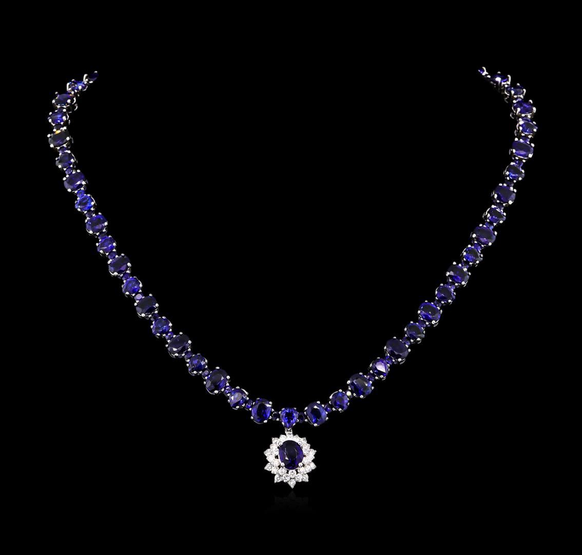 14K White Gold 50CT Sapphire 2.00CT Diamond Necklace. Description: Metal: 14k sold white gold. Face Measurements: 17 x 19mm. Size: 16.5. Finish: Bright Polish. Total Item Weight: 47 grams. Markings: stamped 14k. County Made: USA. Main Stone: sapphire. Quantity: 1. Shape: oval. Color: blue. Carat Total Weight: 2.50. Measurements: 7 x 9mm. Treatment: heating. Setting: prong. Hue: blue. Saturation: moderately strong. Tone: medium. Clarity: type 2. Cut: very good. Secondary Stone: diamond. Quantity: 30. Shape: round. Color: white. Carat Total Weight: 2.00. Measurements: 2.5mm. Treatment: none. Setting: prong. Color Grade: G-H. Clarity: SI1-SI2. Cut: very good. Side Stone: sapphire. Quantity: 107. Shape: oval, pear, round. Color: blue. Carat Total Weight: 47.50. Measurements: 5 x 7 - 5 x 6 - 3mm. Treatment: heating. Setting: prong. Hue: blue. Saturation: moderately strong. Tone: medium. Clarity: type 2. Cut: very good. Excellent Workmanship. Gemstones graded in the mounting. BHGL Appraised at $48,700.00.