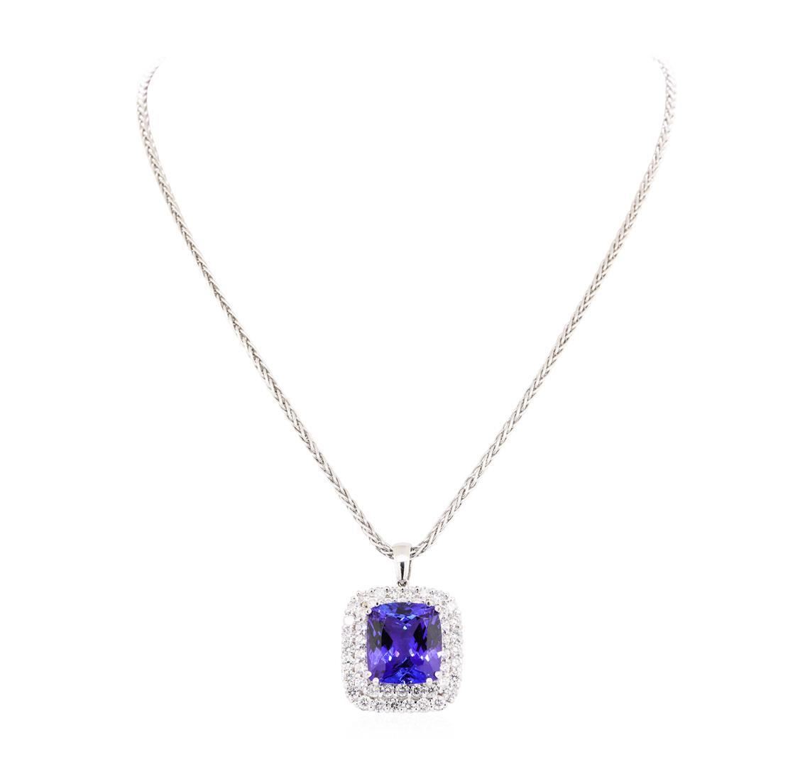 One electronically tested 14KT white gold lady's combination cast & assembled fashion pendant & chain 18.0' long, 2.3 mm square wheat link with a lobster claw clasp with a double cushion halo with a bright polish finish. The featured lady's necklace has a drop of 37 millimeters in length. Identified with markings of '14K'. Condition is new, good workmanship. Containing: One prong set square cushion modified brilliant cut natural tanzanite, measuring 17.20 x 15.55 x 22.65mm, (depth est.) 5%. bulge factor, approximate weight of 50.20 ct., clarity is eye clean, medium dark, strong, violetish blue color, (GIA vB 6/5), cut is very good. Colored gemstones are presumed to have been subjected to commonly used enhancement processes. Transmitting light with no distortion, transparent. Graded in the setting. Twenty-Two prong set round brilliant cut diamonds, measuring 2.80 - 2.75 x 1.70mm (depth est.) approximate total weight of 22 Stones = 1.80 ct. Graded in the setting. Color G - H Clarity VS-2 to SI-2 Cut Very Good Twenty-Six prong set round brilliant cut diamonds, measuring 3.00 - 2.90 x 1.80mm (depth est.) approximate total weight of 26 Stones = 2.50 ct. Graded in the setting. Color H - I Clarity SI-1 to SI-2 Cut Very Good. Total Weight of Colored Stones 50.20 ct.. Total Weight of Diamonds 4.30 ct.. Total Weight of Pendant & Chain 30.00gm GAS Appraised at $59795.00. GAS Appraised.
