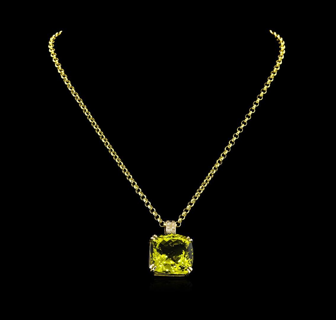 One polished, stamped , and tested 14KT yellow gold pendant mounted with: 1 genuine lemon citrine center stone weighing 50.20ct, and 10 genuine round diamonds weighing 0.15ct. The pendant hangs on a 14KT yellow gold link chain measuring 18 inches in length. This item weighs 21.60 grams, condition is new, excellent workmanship. AIGL Appraised at $5,870.00.