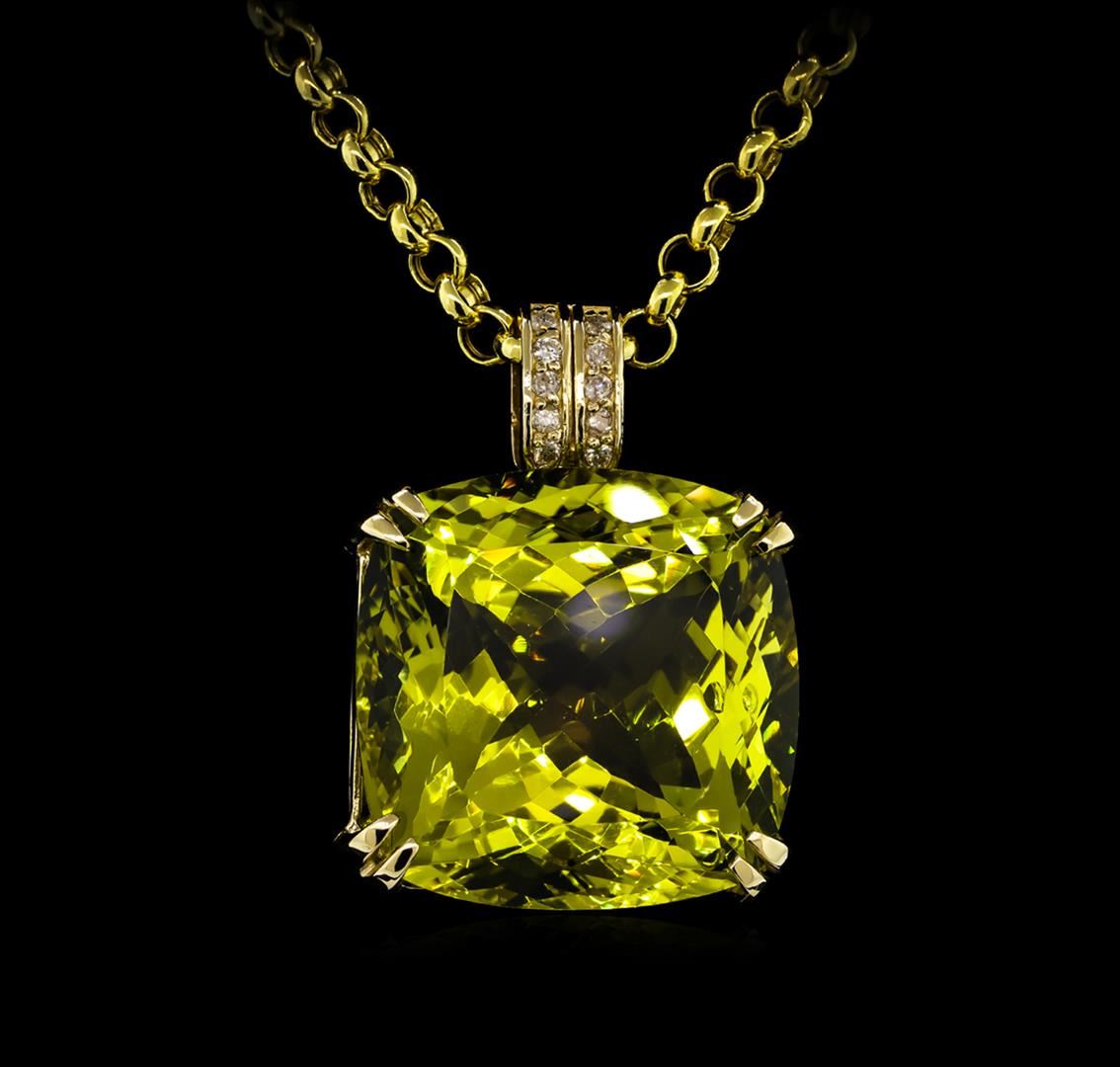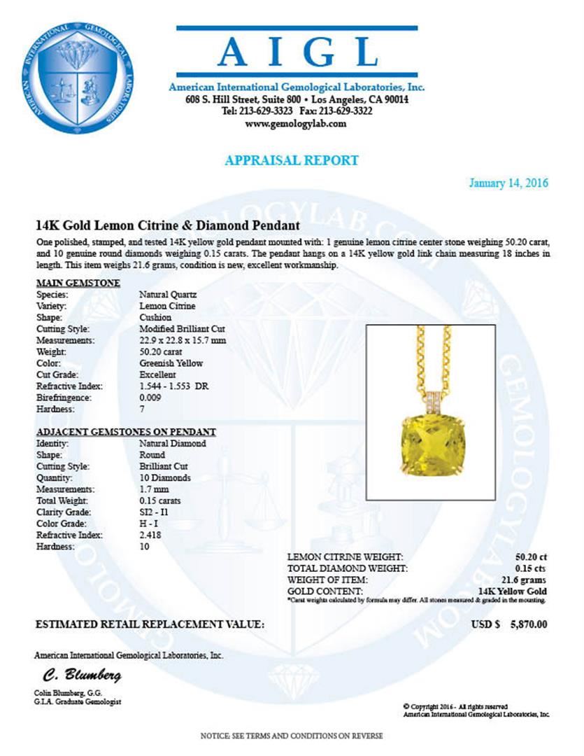 One polished, stamped , and tested 14KT yellow gold pendant mounted with: 1 genuine lemon citrine center stone weighing 50.20ct, and 10 genuine round diamonds weighing 0.15ct. The pendant hangs on a 14KT yellow gold link chain measuring 18 inches in length. This item weighs 21.60 grams, condition is new, excellent workmanship. AIGL Appraised at $5,870.00.