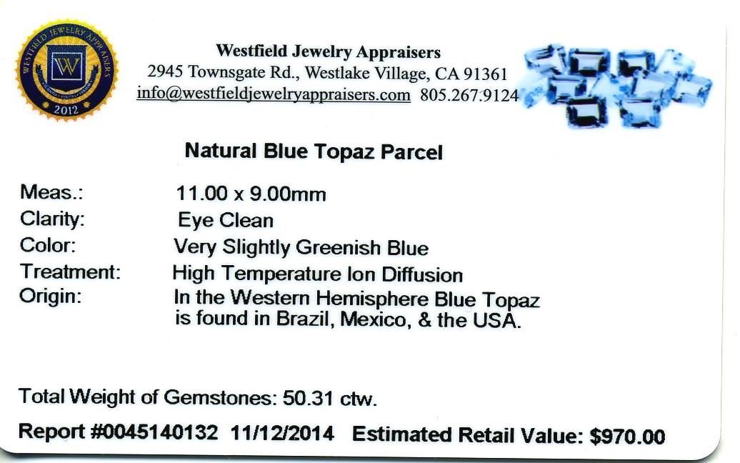 50.31cts Emerald Cut Natural Blue Topaz Parcel. Westfield Appraised at $970.00.