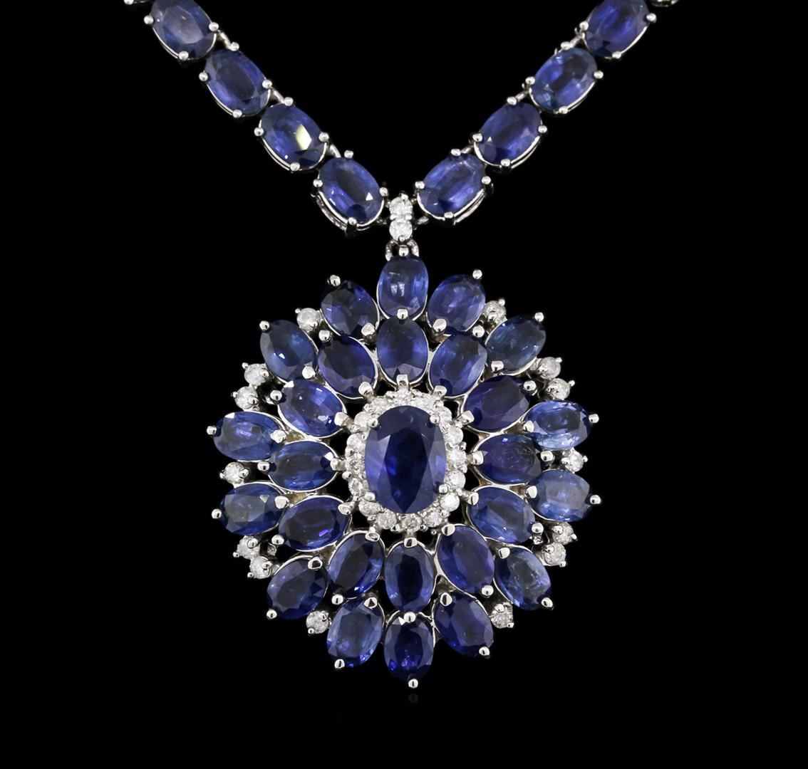 One electronically tested 14KT white gold ladies cast sapphire and diamond necklace with a bright polish finish. Seventeen inch length necklace features a sapphire and diamond stylized floret pendant supported by a sapphire and diamond duo ribbon, terminating in a concealed box clasp with safety. Identified with markings of "K14". Condition is new, good workmanship. Containing: Eighty-seven prong set oval mixed cut natural blue sapphires approximate total weight of 50.95ct., clarity is moderately included, type II, medium dark, very slightly grayish, violetish blue color, (GIA vB 6/3), cut is good. Transmitting light with a minimum of distortion, transparent to translucent. Naturally occurring internal & external characteristics are present, including some partial color zoning. Color grade is an average for the group. Graded in the setting. Fifty-Four prong set round brilliant cut diamonds, measuring 2.00 - 1.80 x 1.14mm (depth est.) approximate total weight of 54 Stones = 1.35ct. Graded in the setting. Clarity: I-1 to I-2. Color: H - J. Total Weight of Colored Stones 50.95ct. Total Weight of Diamonds 1.35ct. AIG Appraised at $25,545.00.