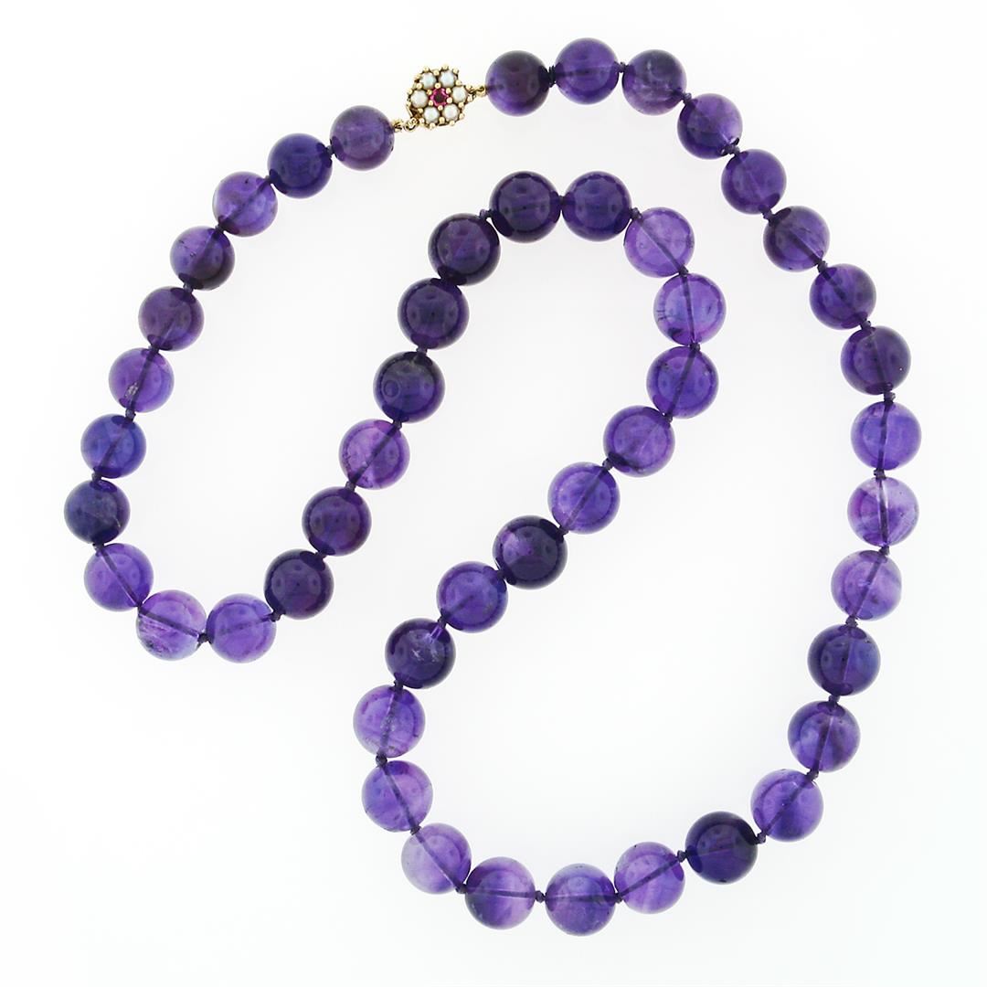 A bead necklace featuring a single strand of 48 round natural amethyst beads (10.88 to 12.43mm - 505ctw) with a solid 14k yellow gold clasp adorned with 6 round bead shaped cultured peals (2.85mm) and 1 old round cut natural ruby (0.15ct). It weighs a total of 106.0 grams, measures 12.4mm wide, and measures 24 inches in length.