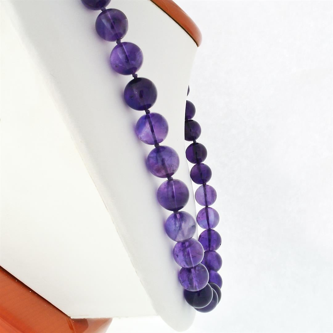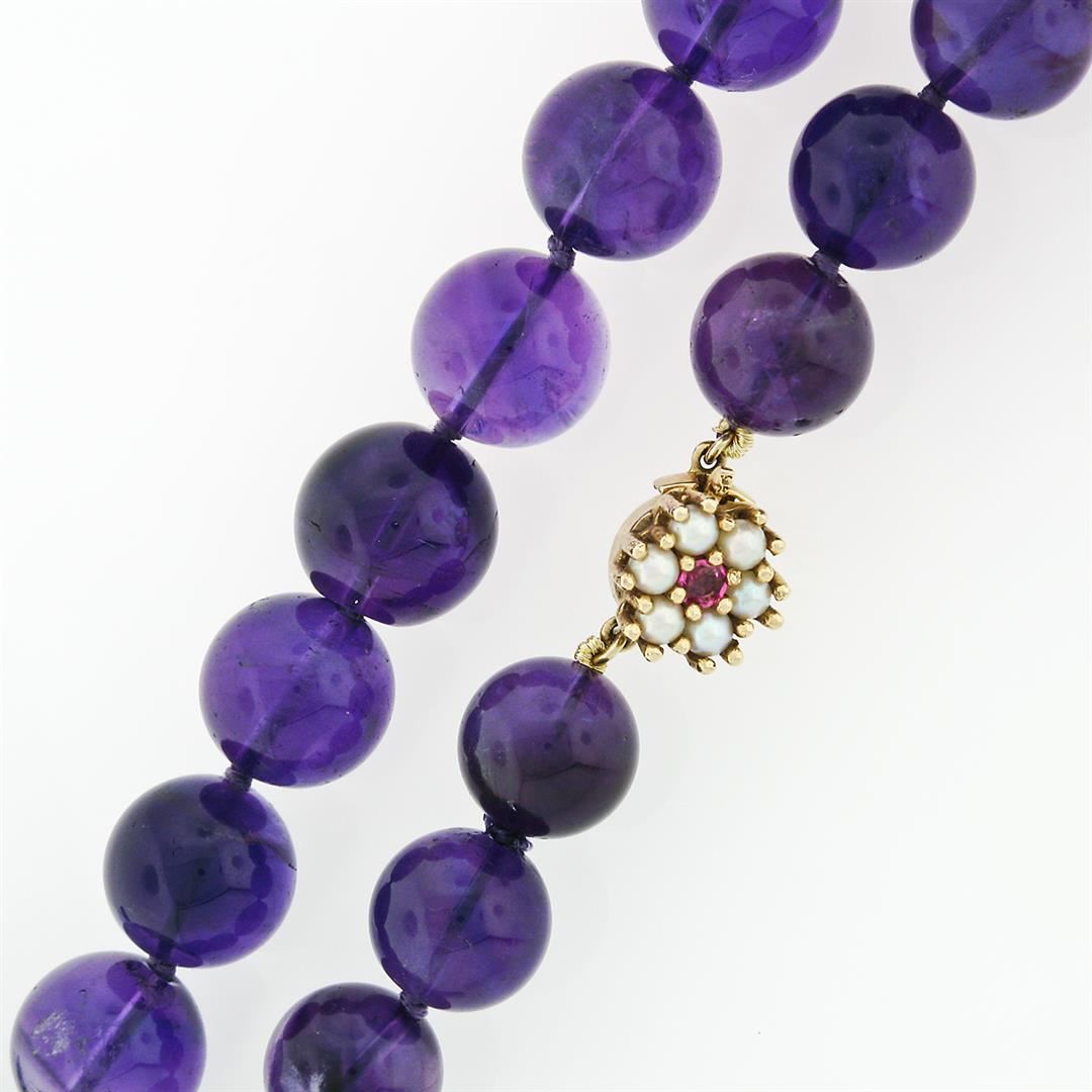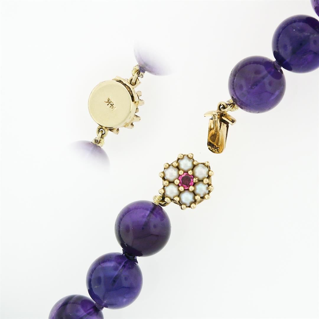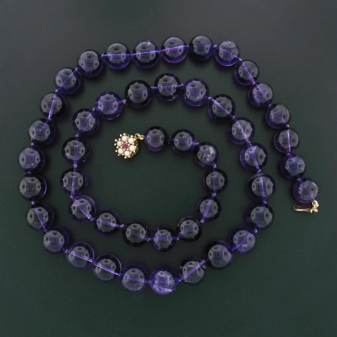 A bead necklace featuring a single strand of 48 round natural amethyst beads (10.88 to 12.43mm - 505ctw) with a solid 14k yellow gold clasp adorned with 6 round bead shaped cultured peals (2.85mm) and 1 old round cut natural ruby (0.15ct). It weighs a total of 106.0 grams, measures 12.4mm wide, and measures 24 inches in length.