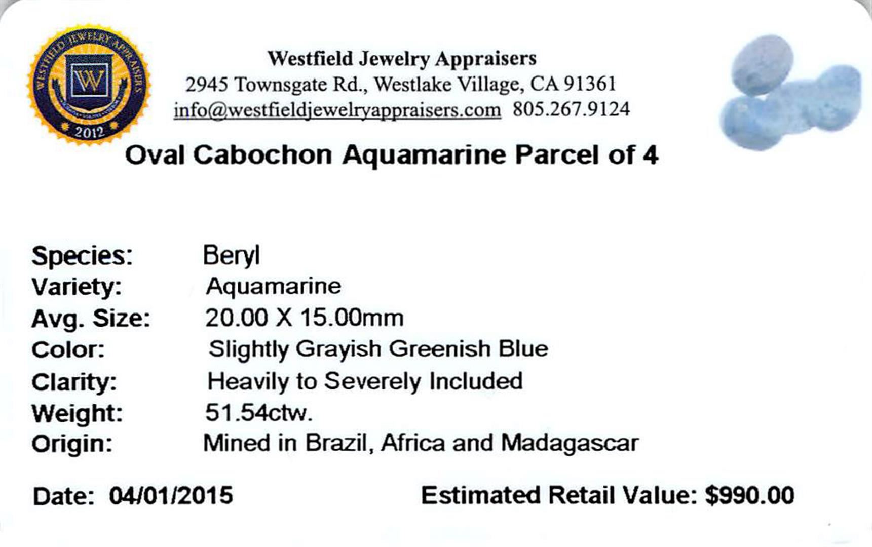 Four oval cabochon cut natural aquamarines exact total weight 51.54ct., clarity is heavily included, type I, medium, slightly grayish, very slightly greenish blue color, (GIA vslgB 5/2), cut is good. Westfield Appraised.