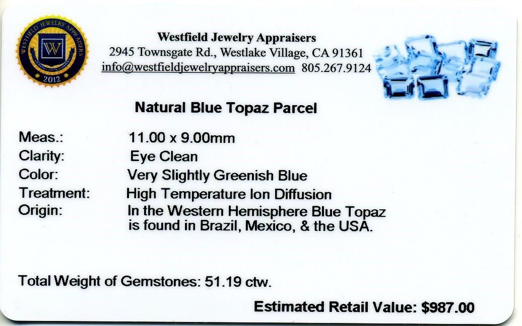 51.59cts Emerald Cut Natural Blue Topaz Parcel. Westfield Appraised at $987.00.