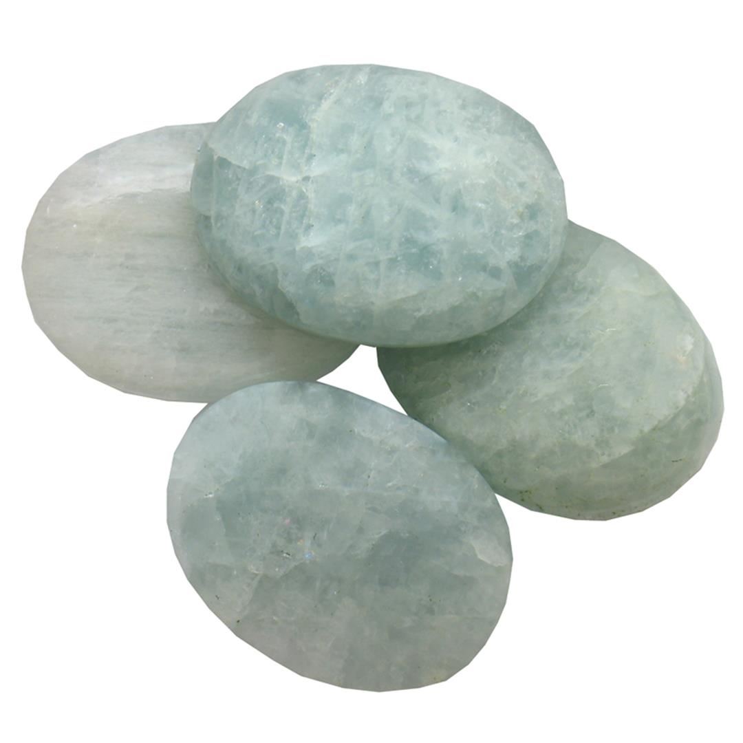 One oval cabochon cut natural aquamarine exact weight 52.12ct., clarity is heavily included, type I, medium, slightly grayish, very slightly greenish blue color, (GIA vslgB 5/2), cut is good. Westfield Appraised at $1,005.00.