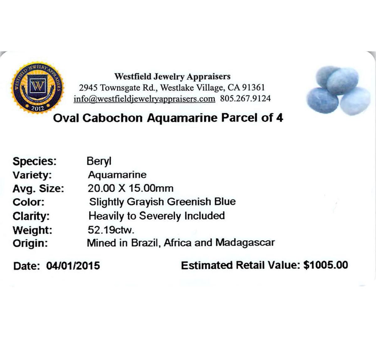 Four oval cabochon cut natural aquamarines exact total weight 52.19ct., clarity is heavily included, type I, medium, slightly grayish, very slightly greenish blue color, (GIA vslgB 5/2), cut is good. Westfield Appraised at $1,005.00.