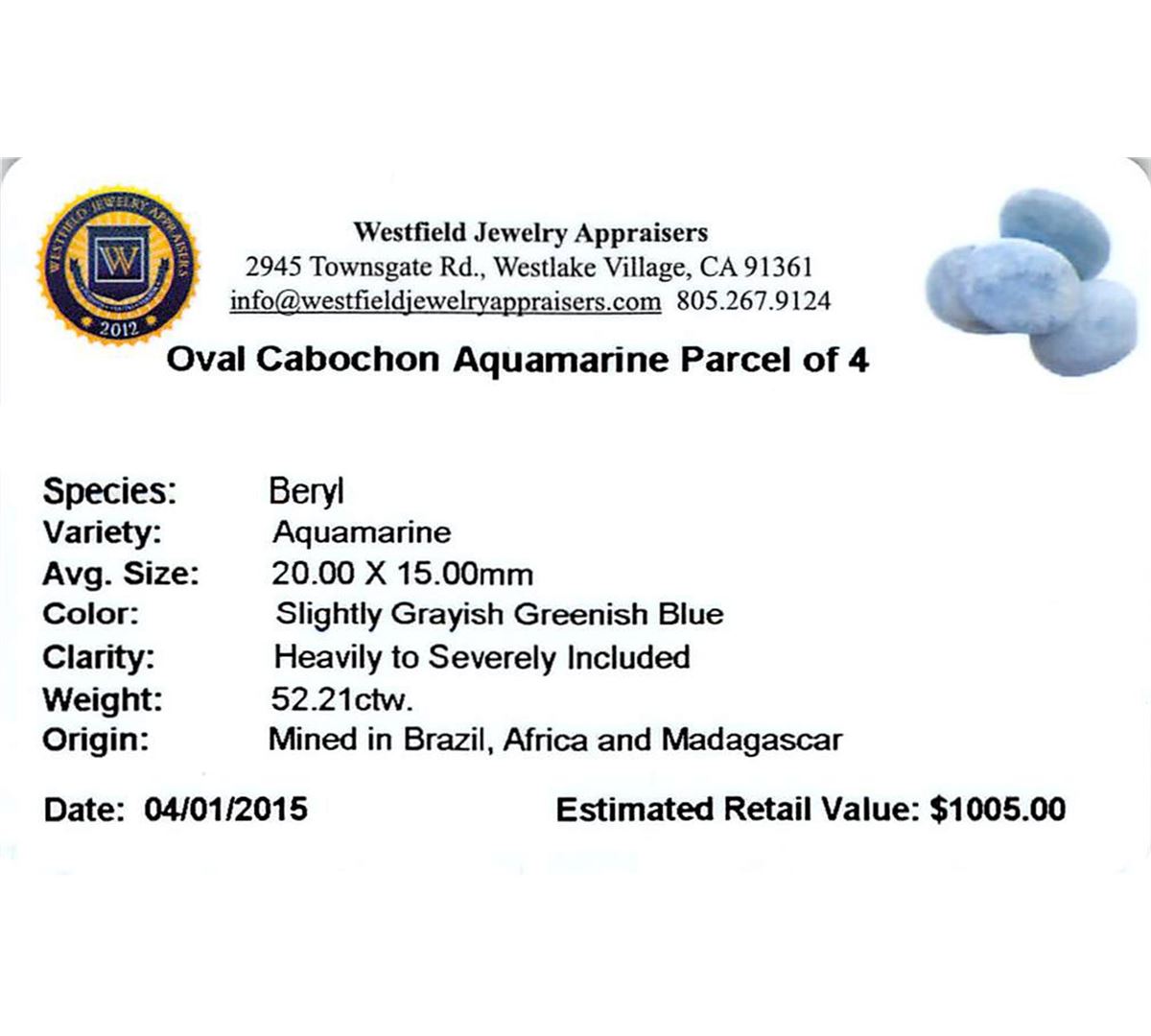 Four oval cabochon cut natural aquamarines exact total weight 52.21ct., clarity is heavily included, type I, medium, slightly grayish, very slightly greenish blue color, (GIA vslgB 5/2), cut is good. Westfield Appraised at $1,005.00.