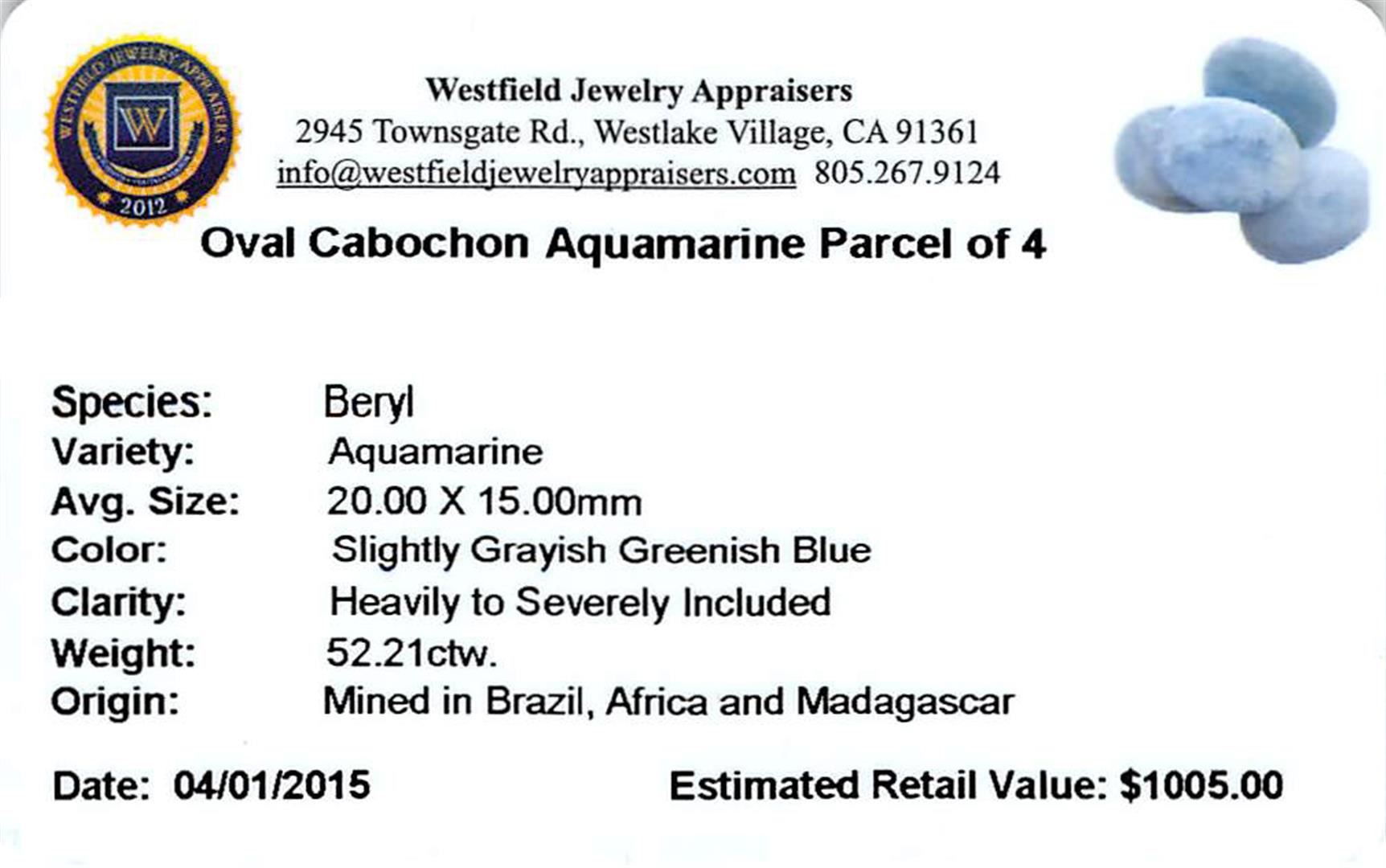 Four oval cabochon cut natural aquamarines exact total weight 52.21ct., clarity is heavily included, type I, medium, slightly grayish, very slightly greenish blue color, (GIA vslgB 5/2), cut is good. Westfield Appraised.