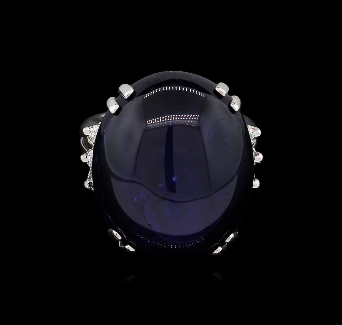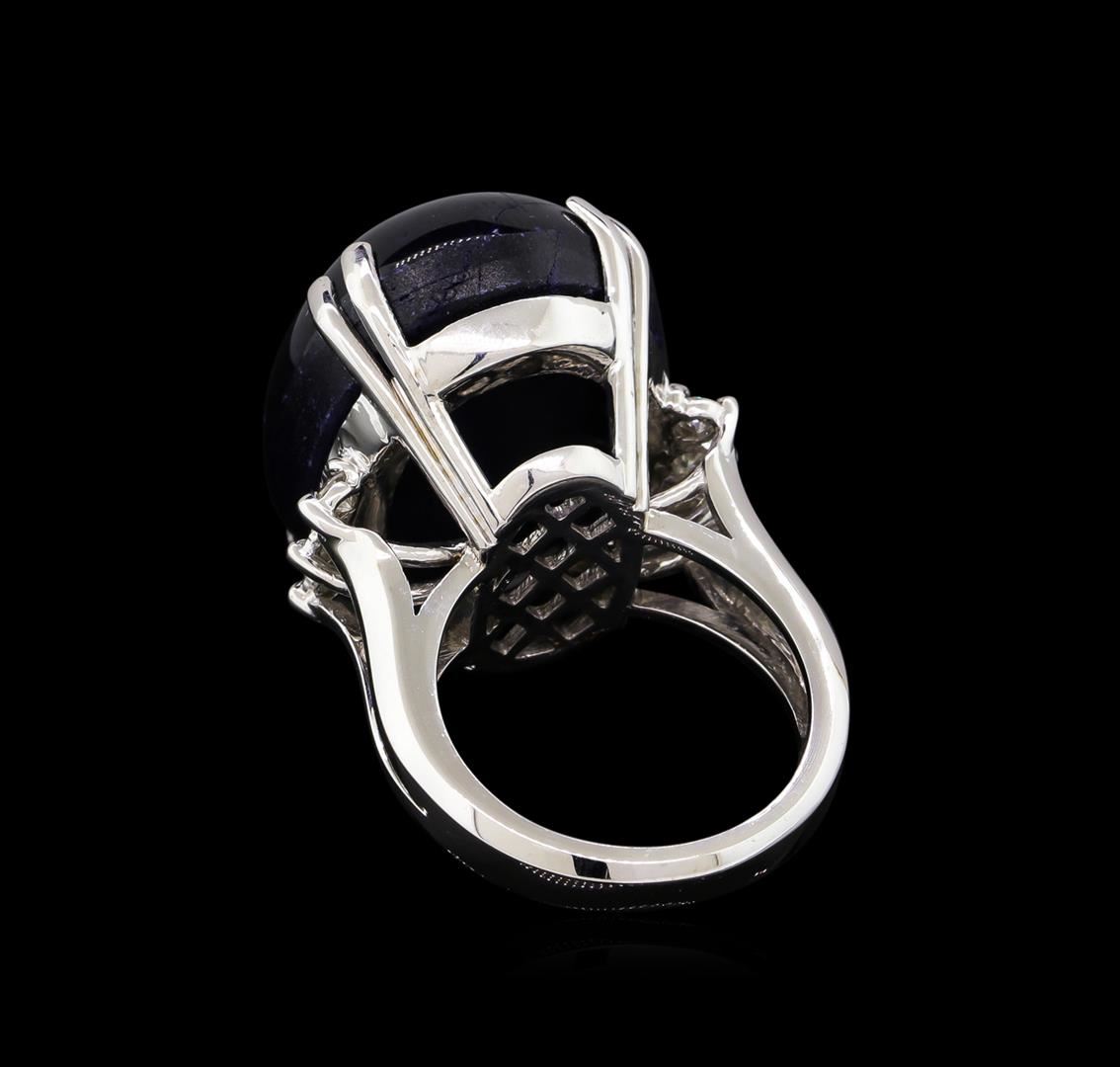 One electronically tested 14KT white gold lady's cast fashion ring with a cathedral shank with a bright polish finish. The featured lady's ring has a shank measuring 4.08 millimeters wide. Identified with markings of "14K". Condition is new, good workmanship. Containing: One prong set oval cabochon cut natural blue star sapphire, measuring 23.61 x 19.52 x 10.80mm, approximate weight of 53.63ct., clarity is heavily included, very dark, moderately strong, blue color, (GIA B 8/4), cut is good. This stone has a mostly complete six ray star with medium intensity and very good movement. Six prong set round brilliant cut diamonds, measuring 2.60 - 2.50 x 1.56mm (depth est.) approximate total weight of 6 Stones = 0.37ct. Clarity: VS-2 to SI-1. Color: H - I. Cut Very Good. Total Weight of Colored Stones 53.63ct. Total Weight of Diamonds 0.37ct. Total Weight of Ring 21.00gm. GAS Appraised at $6,565.00.