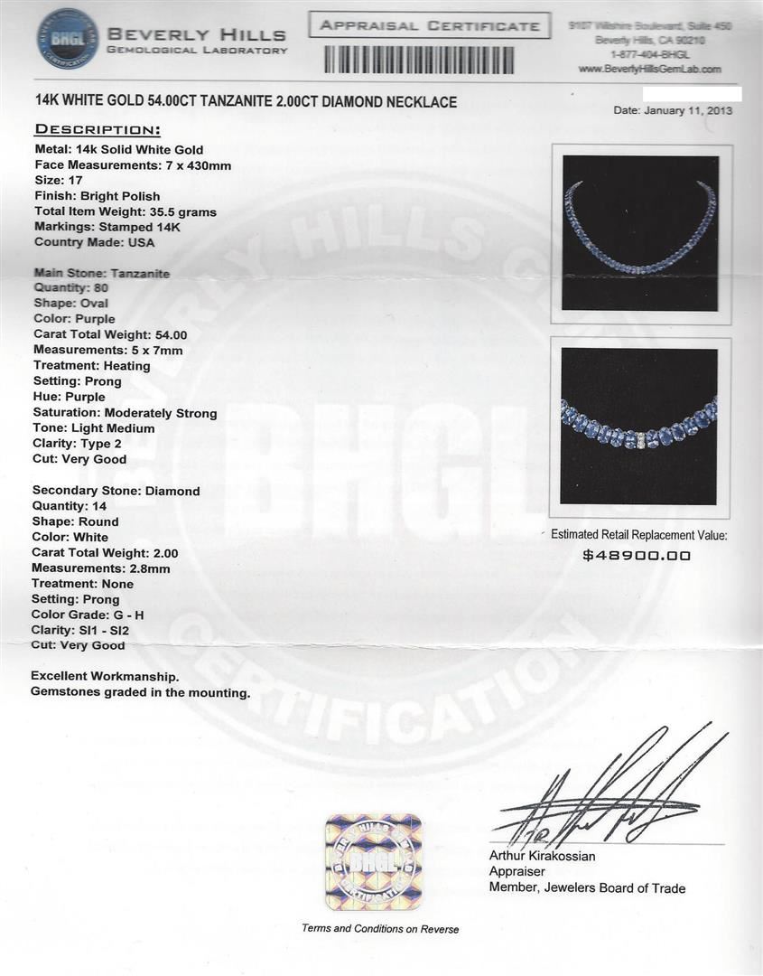14K White Gold 54.00CT Tanzanite 2.00CT Diamond Necklace. Description: Metal: 14k solid white gold. Face Measurements: 7 x 430mm. Size: 17. Finish: bright polish. Total Item Weight: 35.5 grams. Markings: stamped 14K. Country Made: USA. Main Stone: tanzanite. Quantity: 80. Shape: oval. Color: purple. Carat Total Weight: 54.00. Measurements: 5 x 7mm. Treatment: heating. Setting: prong. Hue: purple. Saturation: moderately strong. Tone: light medium. Clarity: type 2. Cut: very good. Secondary Stone: diamond. Quantity: 14. Shape: round. Color: white. Carat Total Weight: 2.00. Measurements: 2.8mm. Treatment: none. Setting: prong. Color Grade: G-H. Clarity: SI1-SI2. Cut: very good. Excellent Workmanship. Gemstones graded in the mounting. BHGL Appraised at $48,900.00.