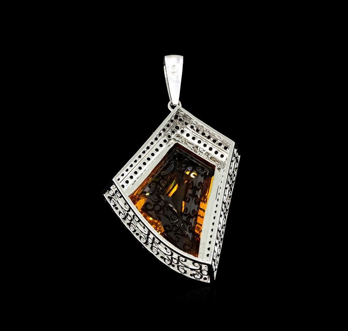 One electronically tested 18KT white gold lady's combination cast & assembled fashion pendant with a bright polish finish. The featured lady's pendant has a freeform motif and a total length 64 millimeters. Identified with markings of '18K'. Condition is new, good workmanship. Containing: One prong set free-form modified step cut natural citrine quartz, measuring 37.80 x 27.90 x 14.60mm, (depth est.) approximate weight of 55.03ct., clarity is eye clean, medium, moderately strong, orange color, (GIA O 5/4), cut is very good. Transmitting light with no distortion, transparent. Colored gemstones are presumed to have been subjected to commonly used enhancement processes. Graded in the setting. Sixty-nine prong set round modified brilliant cut natural pink sapphires, measuring 1.70 - 1.65 x 1.04 mm, (depth est.) approximate total weight of 1.38ct., clarity is eye clean, medium, moderately strong, strongly purplish red color, (GIA stpR 5/4), cut is very good. Transmitting light with no distortion, transparent. Colored gemstones are presumed to have been subjected to commonly used enhancement processes. Graded in the setting. Sixty-one prong set round modified brilliant cut natural blue sapphires, measuring 1.65 - 1.50 x 0.98 mm, (depth est.) approximate total weight of 1.22ct., clarity is eye clean, medium dark, moderately strong, blue color, (GIA B 6/4), cut is very good. Transmitting light with no distortion, transparent. Colored gemstones are presumed to have been subjected to commonly used enhancement processes. Graded in the setting. Eleven prong set round brilliant cut diamonds, measuring 1.80 - 1.70 x 1.09mm (depth est.) approximate total weight of 11 Stones = 0.23ct. Graded in the setting. Clarity SI-1 to SI-2. Color: G - H Cut Good. Total Weight of Colored Stones 57.63ct.. Total Weight of Diamonds 0.23ct.. Total Weight of Pendant 27.70gm GAS Appraised at $12,515.00.