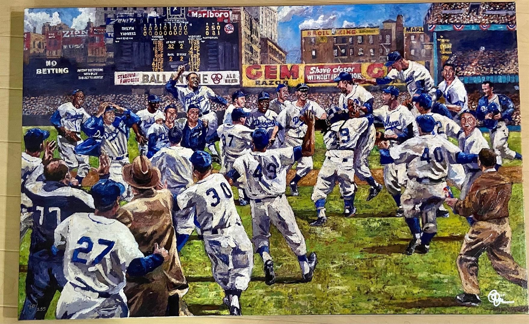 Otterstad captures the excitement of the '55 Brooklyn Dodgers winning the World Series in this 27x43 stretched, hand-embellished giclee on canvas, ready for hanging