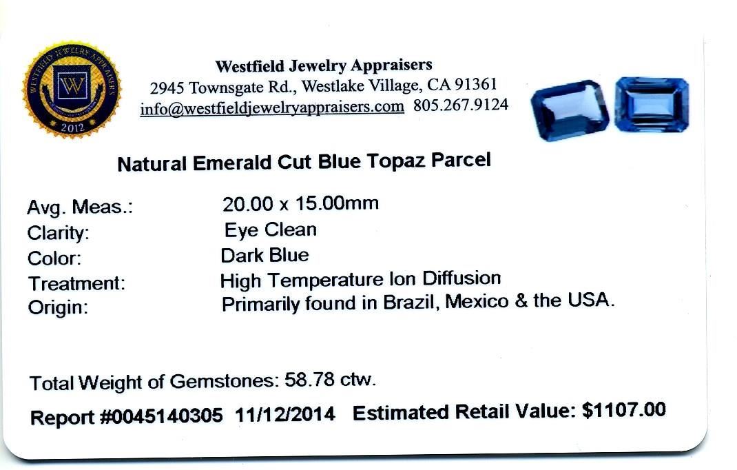 58.78ctw. Natural Emerald Cut Blue Topaz Parcel. Westfield Appraised at $1,107.00.