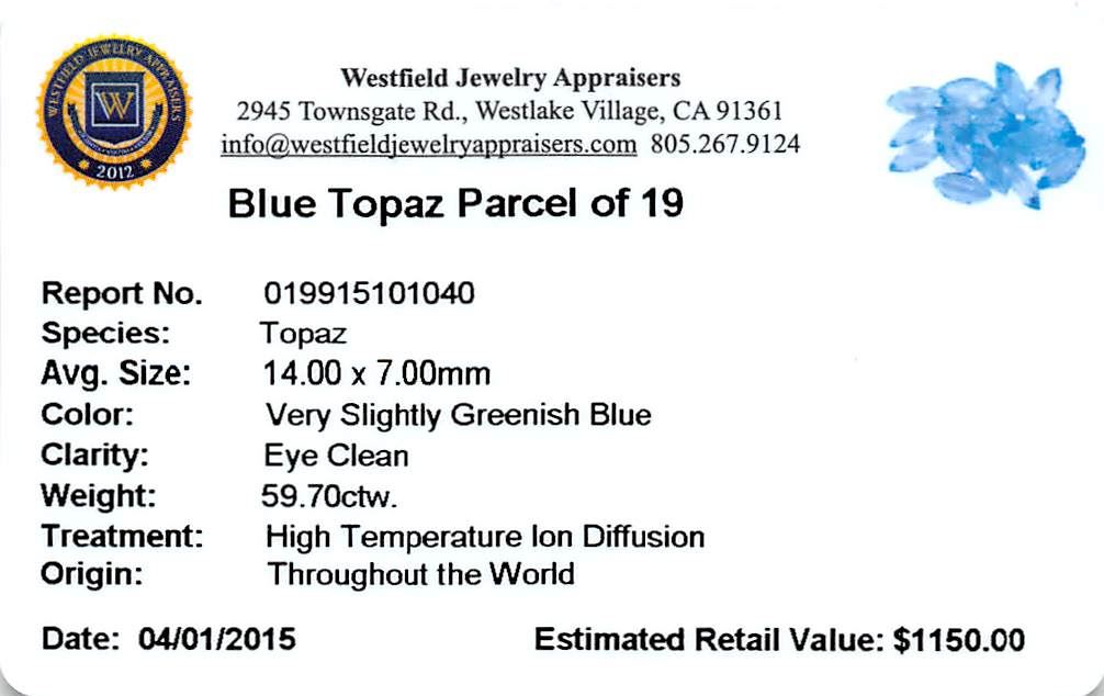 Nineteen marquise mixed cut natural blue topazs exact total weight 59.70ct., clarity is eye clean, type I, medium dark, moderately strong, very slightly greenish blue color, (GIA vslgB 6/4), cut is good. Westfield Appraised at $1,150.00.