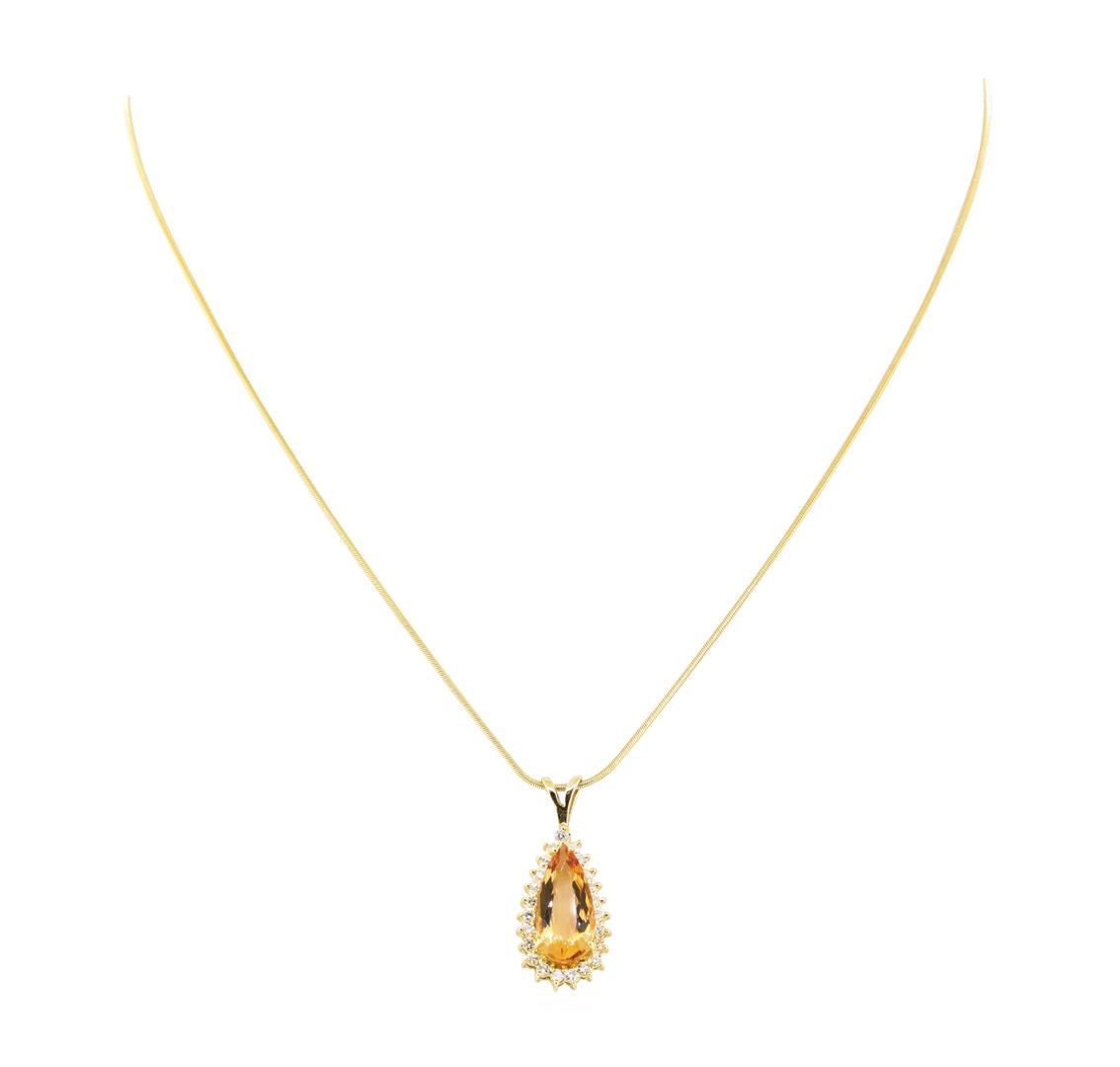 One electronically tested 18KT yellow gold lady's combination cast & assembled fashion pendant & chain 18.0' long, 1mm round snake chain with a lobster claw clasp with a bright polish finish. Identified with markings of '18K'. Condition is new, good workmanship. Containing: One prong set pear modified mixed cut natural imperial topaz, measuring 16.20 x 7.70 x 5.25mm, (depth est.) approximate weight of 5.30 ct., clarity is eye clean, medium, strong, reddish orange color, (GIA rO 5/5), cut is very good. Transmitting light with no distortion, transparent. Colored gemstones are presumed to have been subjected to commonly used enhancement processes. Graded in the setting. Twenty-Three prong set round brilliant cut diamonds, measuring 2.00 - 1.95 x 1.23mm (depth est.) approximate total weight of 23 Stones = 0.70 ct. Graded in the setting. Color G - H Clarity VS-1 to VS-2 Cut Very Good. Total Weight of Colored Stones 5.30 ct.. Total Weight of Diamonds 0.70 ct.. Total Weight of Pendant & Chain 9.70gm GAS Appraised at $13390.00. GAS Appraised.