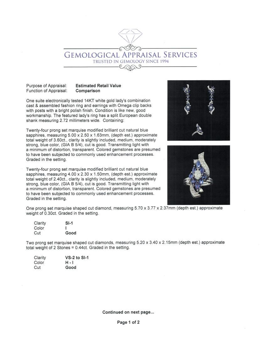 One suite electronically tested 14KT white gold lady's combination cast & assembled fashion ring and earrings with Omega clip backs with posts with a bright polish finish. The featured lady's ring has a split European double shank measuring 2.72 millimeters wide. Condition is like new, good workmanship. Containing: Twenty-four prong set marquise modified brilliant cut natural blue sapphires, measuring 5.00 x 2.50 x 1.63mm, (depth est.) approximate total weight of 3.60ct., clarity is slightly included, medium, moderately strong, blue color, (GIA B 5/4), cut is good. Transmitting light with a minimum of distortion, transparent. Colored gemstones are presumed to have been subjected to commonly used enhancement processes. Graded in the setting. Twenty-four prong set marquise modified brilliant cut natural blue sapphires, measuring 4.00 x 2.30 x 1.50mm, (depth est.) approximate total weight of 2.40ct., clarity is slightly included, medium, moderately strong, blue color, (GIA B 5/4), cut is good. Transmitting light with a minimum of distortion, transparent. Colored gemstones are presumed to have been subjected to commonly used enhancement processes. Graded in the setting. One prong set marquise shaped cut diamond, measuring 5.70 x 3.77 x 2.37mm (depth est.) approximate weight of 0.30ct. Graded in the setting. Color I Clarity SI-1 Cut Good Two prong set marquise shaped cut diamonds, measuring 5.20 x 3.40 x 2.15mm (depth est.) approximate total weight of 2 Stones = 0.44ct. Graded in the setting. Color H - I Clarity VS-2 to SI-1 Cut Good Twenty-Five prong set round brilliant cut diamonds, measuring 2.10 - 2.00 x 1.27mm (depth est.) approximate total weight of 25 Stones = 0.82ct. Graded in the setting. Color H - I Clarity VS-2 to SI-1 Cut Very Good Forty-One prong set single cut diamonds, measuring 2.10 - 1.40 x 1.09mm (depth est.) approximate total weight of 41 Stones = 0.79ct. Graded in the setting. Color H - I Clarity SI-1 to I-1 Cut Good. Total Weight of Colored Stones 6.00ct.. Total Weight of Diamonds 2.35ct.. Total Weight of Ring And Earrings 19.20gm GAS Appraised at $11,170.00.