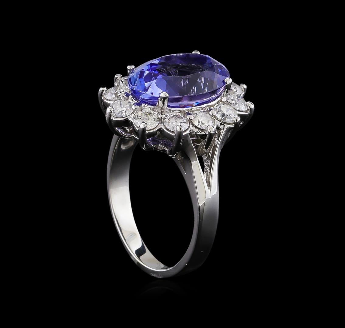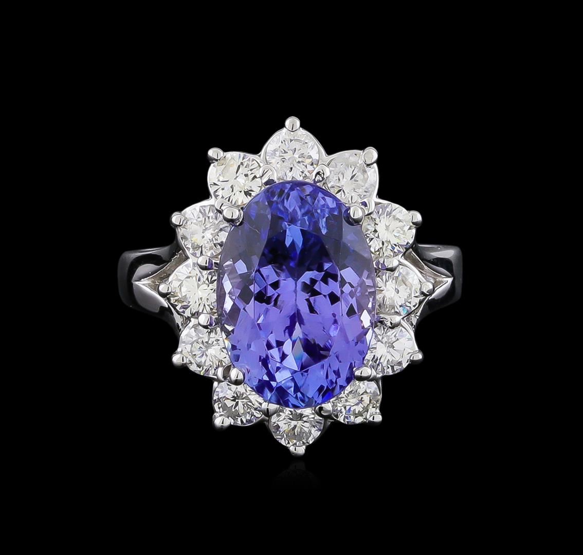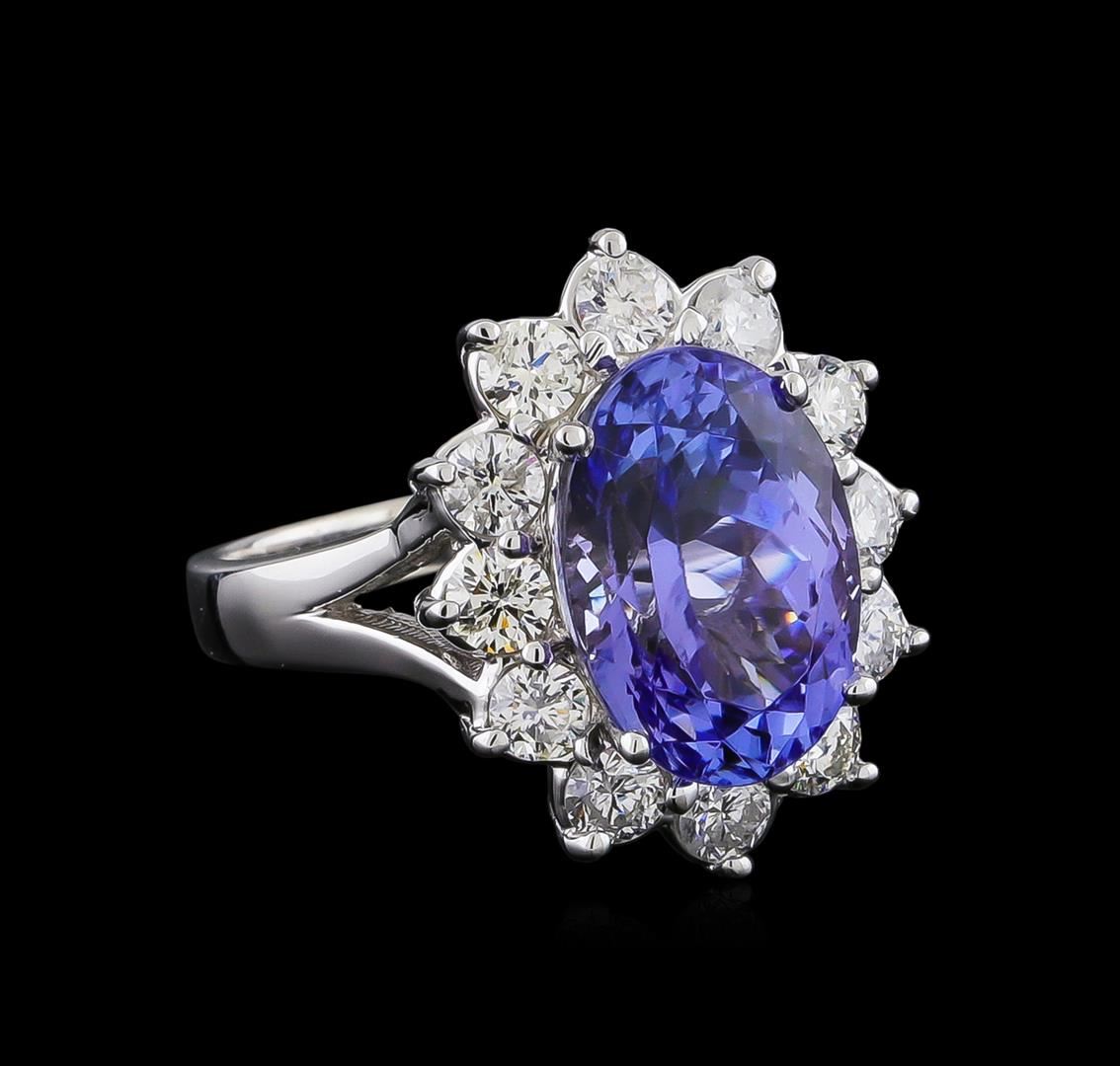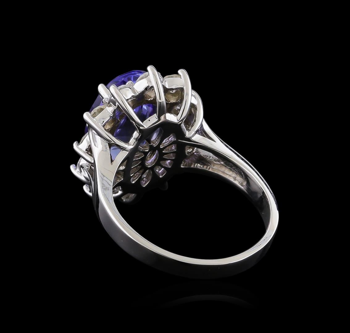 One electronically tested 14KT white gold lady's cast fashion ring with a basket halo with a bright polish finish. The featured lady's ring has a shank measuring 2.55 millimeters wide. Identified with markings of "14K". Condition is new, good workmanship. Containing: One prong set oval modified brilliant cut natural tanzanite, measuring 12.85 x 8.93 x 7.20mm, 3%. bulge factor, approximate weight of 6.00ct., clarity is eye clean, type I, medium, very slightly grayish, bluish violet color, (GIA bV 5/3), cut is very good. Transmitting light with no distortion, transparent. Colored gemstones are presumed to have been subjected to commonly used enhancement processes. Graded in the setting. Twelve prong set round brilliant cut diamonds, measuring 3.00 - 2.95 x 1.85mm (depth est.) approximate total weight of 12 Stones = 1.20ct. Graded in the setting. Clarity: SI-1 to I-1. Color: H - I. Cut Very Good. Total Weight of Colored Stones 6.00ct. Total Weight of Diamonds 1.20ct. Total Weight of Ring 6.80gm. GAS Appraised at $12,540.00.