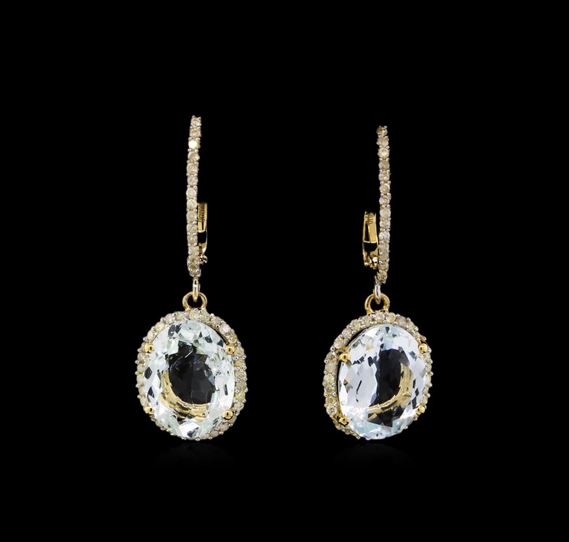 One pair electronically tested 14KT yellow gold lady's combination cast & assembled dangle earrings with hinged, snap locking posts with a bright polish finish. Trademark is Orianne. Identified with markings of "14K". Condition is new, good workmanship. Containing: Two prong set oval modified brilliant cut natural aquamarines, measuring 11.61 x 8.82 x 4.73mm, 9%. bulge factor, approximate total weight of 6.00ct., clarity is slightly included, type I, very light, moderately strong, very slightly greenish blue color, (GIA vslgB 2/4), cut is good. Transmitting light with no distortion, transparent. Colored gemstones are presumed to have been subjected to commonly used enhancement processes. Graded in the setting. Ninety prong set round brilliant cut diamonds, measuring 1.25 - 1.15 x 0.74mm (depth est.) approximate total weight of 90 Stones = 0.60ct. Graded in the setting. Clarity: I-1 to I-2. Color: I - Good. Total Weight of Colored Stones 6.00ct. Total Weight of Diamonds 0.60ct. Total Weight of Earrings 4.00gm. GAS Appraised at $7,395.00.