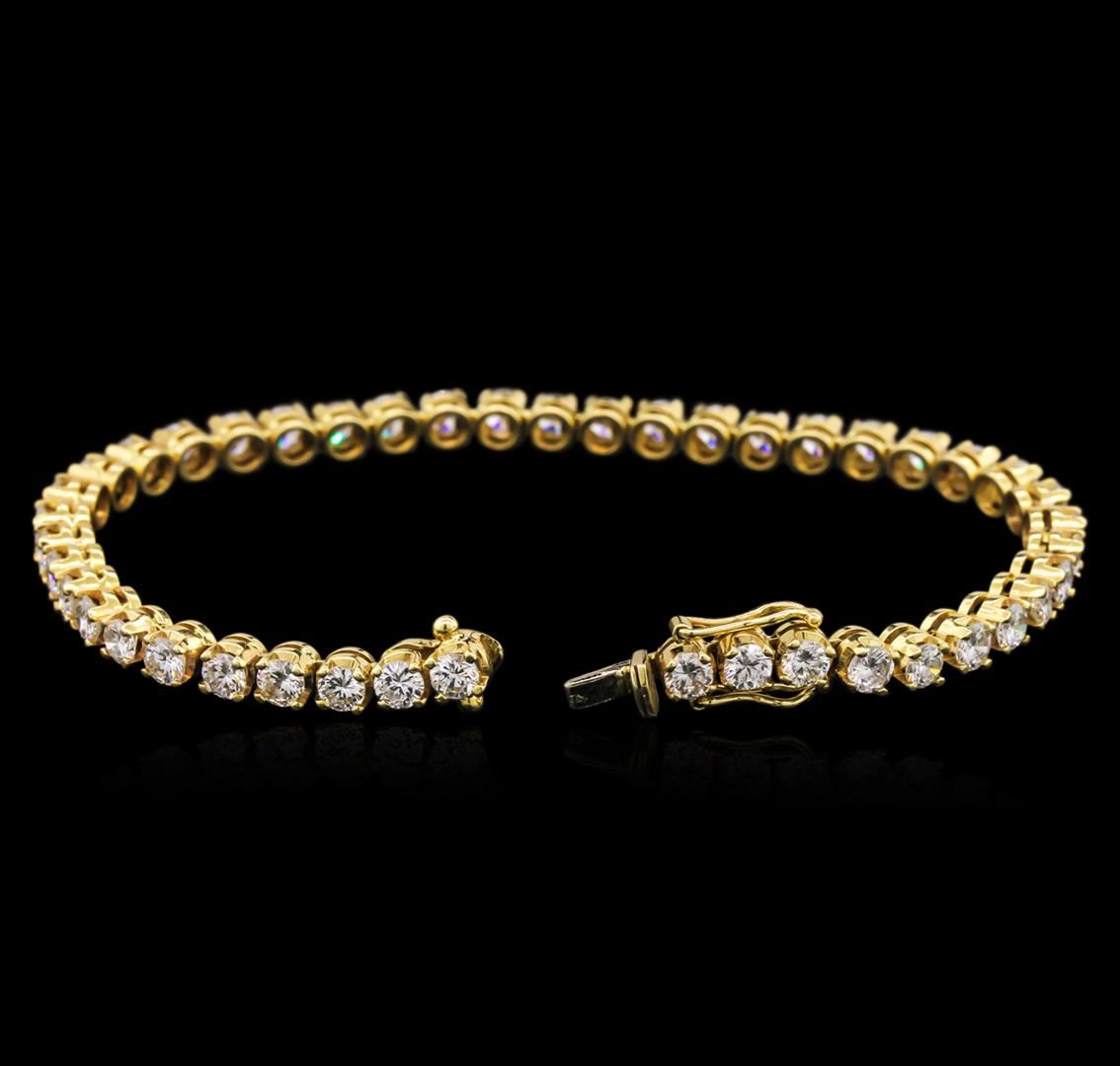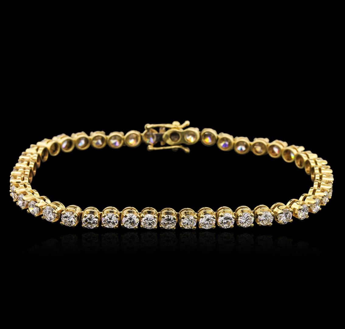 One electronically tested 14KT yellow gold lady's combination cast & assembled tennis bracelet with a tongue clasp with foldover safety with a bright polish finish. The featured lady's tennis bracelet measures 7 inches in length. Identified with markings of "14K". Condition is new, good workmanship. Containing: Forty-Four prong set round brilliant cut diamonds, measuring 3.30 - 3.20 x 2.11mm (depth est.) approximate total weight of 44 Stones = 6.00ct. Graded in the setting. Clarity: VS-1 to SI-1. Color: F - H. Cut Very Good. Total Weight of Diamonds 6.00ct. Total Weight of Bracelet 11.70gm at $16170.00.. GAS Appraised at $16,170.00.