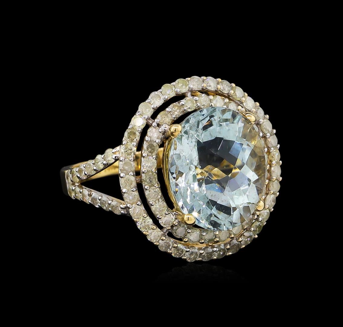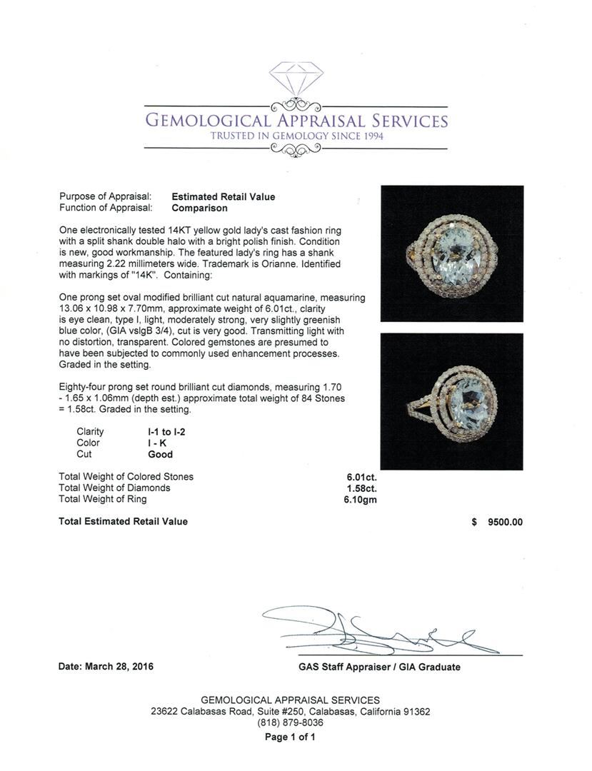 One electronically tested 14KT yellow gold lady's cast fashion ring with a split shank double halo with a bright polish finish. The featured lady's ring has a shank measuring 2.22 millimeters wide. Trademark is Orianne. Identified with markings of "14K". Condition is new, good workmanship. Containing: One prong set oval modified brilliant cut natural aquamarine, measuring 13.06 x 10.98 x 7.70mm, approximate weight of 6.01ct., clarity is eye clean, type I, light, moderately strong, very slightly greenish blue color, (GIA vslgB 3/4), cut is very good. Transmitting light with no distortion, transparent. Colored gemstones are presumed to have been subjected to commonly used enhancement processes. Graded in the setting. Eighty-Four prong set round brilliant cut diamonds, measuring 1.70 - 1.65 x 1.06mm (depth est.) approximate total weight of 84 Stones = 1.58ct. Graded in the setting. Clarity: I-1 to I-2. Color: I - K. Cut Good. Total Weight of Colored Stones 6.01ct. Total Weight of Diamonds 1.58ct. Total Weight of Ring 6.10gm. GAS Appraised at $9,500.00.