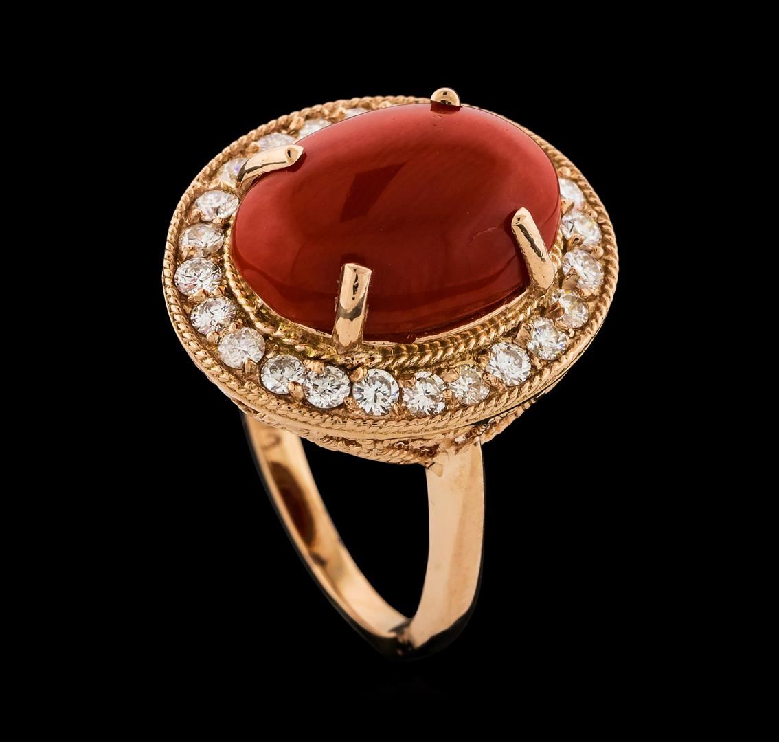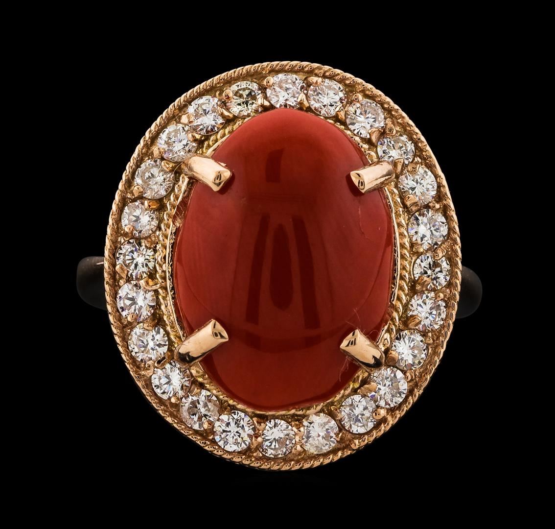 One electronically tested 14KT rose gold lady's cast fashion ring with a basket halo with a bright polish with milgrain detailing finish. The featured lady's ring has a shank measuring 1.95 millimeters wide. Identified with markings of 'K14'. Condition is new, good workmanship. Containing: One prong set oval cabochon standard cut natural red coral, measuring 15.35 x 11.03 x 4.92mm, (depth est.) approximate weight of 6.04ct., clarity is slightly included, medium, very slightly brownish, orangy red color, (GIA oR 5/3), cut is very good. Colored gemstones are presumed to have been subjected to commonly used enhancement processes. Graded in the setting. Twenty-Four prong set round brilliant cut diamonds, measuring 2.10 - 2.00 x 1.27mm (depth est.) approximate total weight of 24 Stones = 0.80ct. Graded in the setting. Clarity SI-1 to I-1. Color: G - H Cut Good. Total Weight of Colored Stones 6.04ct.. Total Weight of Diamonds 0.80ct.. Total Weight of Ring 8.00gm. GAS Appraised at $5,515.00.