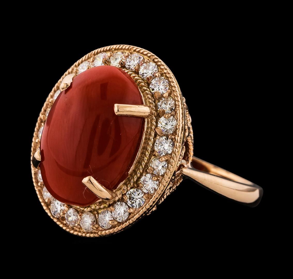One electronically tested 14KT rose gold lady's cast fashion ring with a basket halo with a bright polish with milgrain detailing finish. The featured lady's ring has a shank measuring 1.95 millimeters wide. Identified with markings of 'K14'. Condition is new, good workmanship. Containing: One prong set oval cabochon standard cut natural red coral, measuring 15.35 x 11.03 x 4.92mm, (depth est.) approximate weight of 6.04ct., clarity is slightly included, medium, very slightly brownish, orangy red color, (GIA oR 5/3), cut is very good. Colored gemstones are presumed to have been subjected to commonly used enhancement processes. Graded in the setting. Twenty-Four prong set round brilliant cut diamonds, measuring 2.10 - 2.00 x 1.27mm (depth est.) approximate total weight of 24 Stones = 0.80ct. Graded in the setting. Clarity SI-1 to I-1. Color: G - H Cut Good. Total Weight of Colored Stones 6.04ct.. Total Weight of Diamonds 0.80ct.. Total Weight of Ring 8.00gm. GAS Appraised at $5,515.00.
