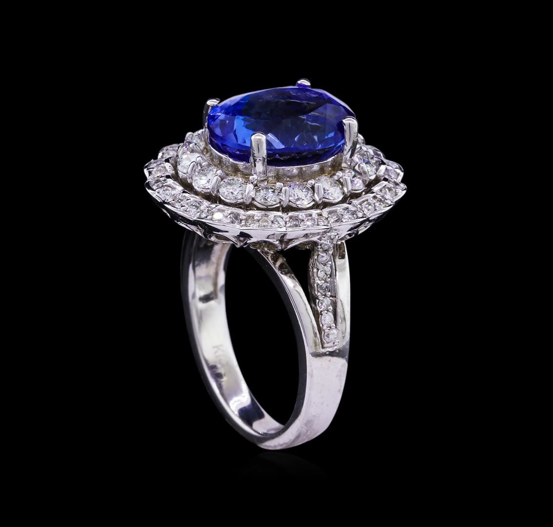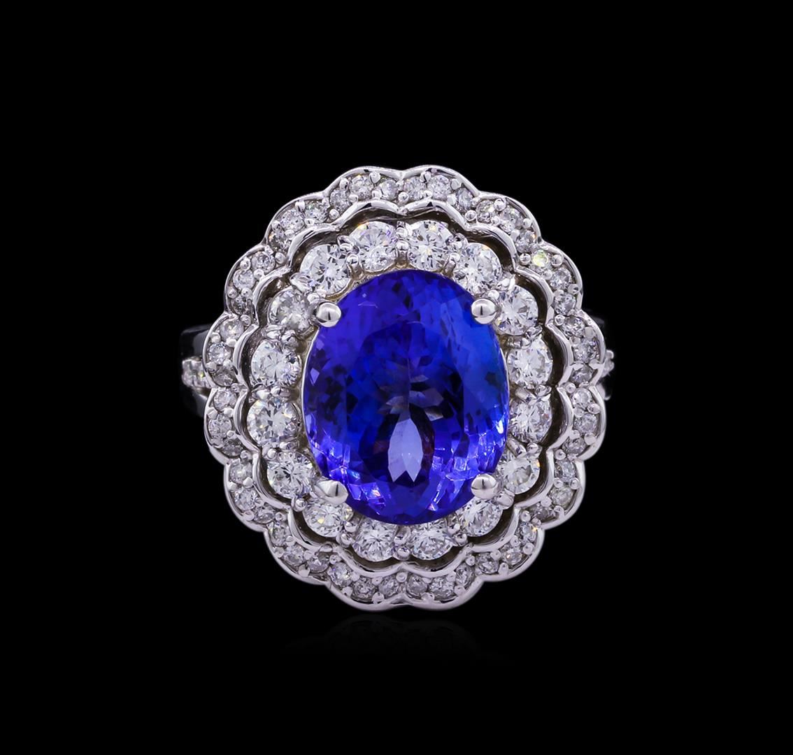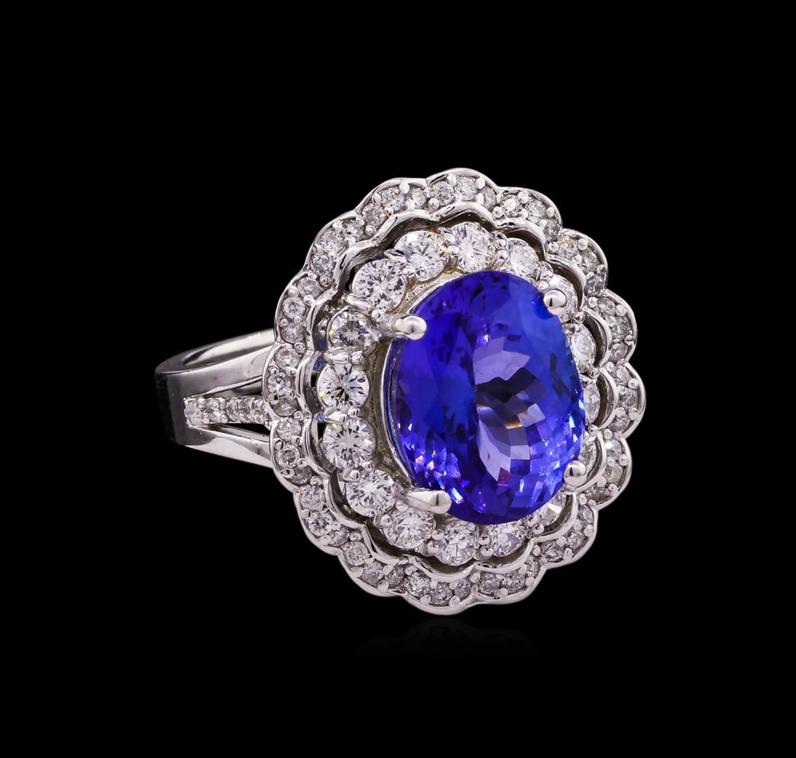 One electronically tested 14KT white gold lady's cast fashion ring with a scalloped double basket halo with a bright polish finish. The featured lady's ring has a shank measuring 2.97 millimeters wide. Identified with markings of "K14". Condition is new, good workmanship. Containing: One prong set oval modified brilliant cut natural tanzanite, measuring 11.98 x 9.57 x 6.87mm, 10%. bulge factor, approximate weight of 6.05ct., clarity is eye clean, type I, medium dark, moderately strong, violetish blue color, (GIA vB 6/4), cut is very good. Transmitting light with no distortion, transparent. Colored gemstones are presumed to have been subjected to commonly used enhancement processes. Graded in the setting. Sixteen prong set round brilliant cut diamonds, measuring 2.40 - 2.35 x 1.45mm (depth est.) approximate total weight of 16 Stones = 0.80ct. Graded in the setting. Clarity: VS-2 to SI-1. Color: G - H. Cut Very Good Sixty-Two prong set round brilliant cut diamonds, measuring 1.30 - 1.20 x 0.75mm (depth est.) approximate total weight of 62 Stones = 0.44ct. Graded in the setting. Clarity: SI-1 to I-1. Color: H - I. Cut Good. Total Weight of Colored Stones 6.05ct. Total Weight of Diamonds 1.24ct. Total Weight of Ring 9.30gm. GAS Appraised at $15,715.00.