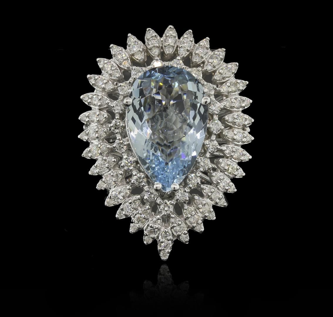 One electronically tested 14KT white gold lady's cast ballerina ring with a basket setting with a bright polish finish. The featured lady's ring has a 3.60 millimeter wide shank. Identified with markings of "K14". Condition is new, good workmanship. Containing: One prong set pear mixed cut natural aquamarine, measuring 17.72 x 11.35 x 5.50mm, approximate weight of 6.06ct., clarity is eye clean, type I, medium, very slightly grayish, greenish blue color, (GIA gB 5/3), cut is very good. Transmitting light with no distortion, transparent. Colored gemstones are presumed to have been subjected to commonly used enhancement processes. Graded in the setting. Nineteen prong set round brilliant cut diamonds, measuring 1.80 - 1.70 x 1.14mm (depth est.) approximate total weight of 19 Stones = 0.40ct. Graded in the setting. Clarity: SI-1 to I-1. Color: G - I. Cut Good Thirty-Two shared prong set round brilliant cut diamonds, measuring 1.60 - 1.50 x 0.99mm (depth est.) approximate total weight of 32 Stones = 0.46ct. Graded in the setting. Clarity: SI-1 to I-1. Color: G - I. Cut Good Sixty-Four prong set round brilliant cut diamonds, measuring 1.40 - 1.30 x 0.88mm (depth est.) approximate total weight of 64 Stones = 0.64ct. Graded in the setting. Clarity: SI-1 to I-1. Color: G - I. Cut Good. Total Weight of Colored Stones 6.06ct. Total Weight of Diamonds 1.50ct. Total Weight of Ring 12.80gm. GAS Appraised at $12,605.00.