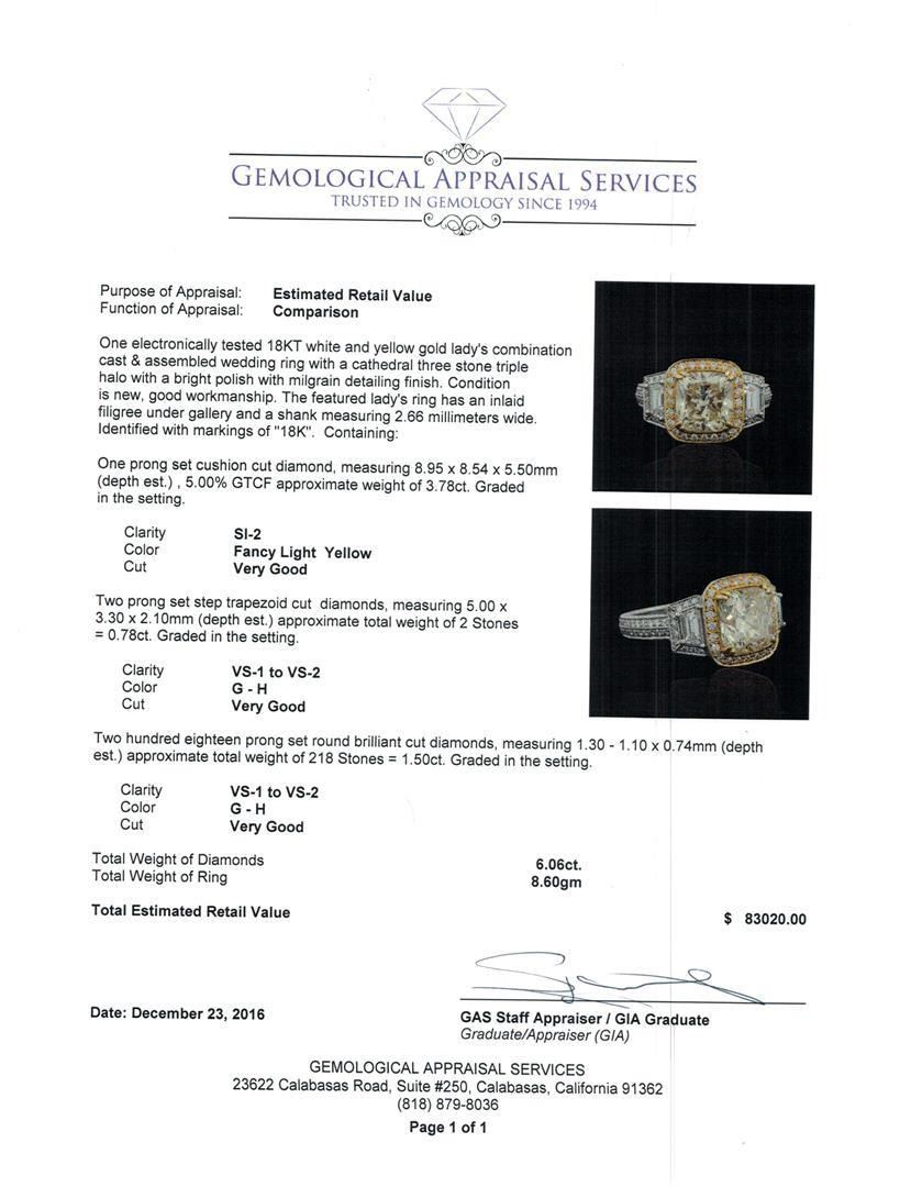 One electronically tested 18KT white and yellow gold lady's combination cast & assembled wedding ring with a cathedral three stone triple halo with a bright polish with milgrain detailing finish. The featured lady's ring has an inlaid filigree under gallery and a shank measuring 2.66 millimeters wide. Identified with markings of '18K'. Condition is new, good workmanship. Containing: One prong set cushion cut diamond, measuring 8.95 x 8.54 x 5.50mm (depth est.) , 5.00.%. GTCF approximate weight of 3.78ct. Graded in the setting. Clarity SI-2 Cut Very Good Two prong set step trapezoid cut diamonds, measuring 5.00 x 3.30 x 2.10mm (depth est.) approximate total weight of 2 Stones = 0.78ct. Graded in the setting. Clarity VS-1 to VS-2. Color: G - H Cut Very Good Two Hundred Eighteen prong set round brilliant cut diamonds, measuring 1.30 - 1.10 x 0.74mm (depth est.) approximate total weight of 218 Stones = 1.50 ct. Graded in the setting. Clarity VS-1 to VS-2. Color: G - H Cut Very Good. Total Weight of Diamonds 6.06ct.. Total Weight of Ring 8.60gm. GAS Appraised.