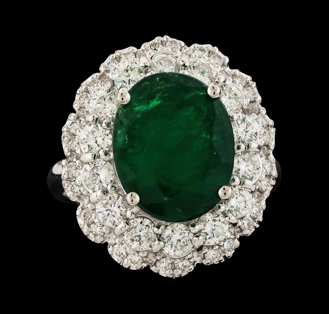 One electronically tested 14KT white gold lady's cast fashion ring with a scalloped double basket halo with a bright polish finish. The featured lady's ring has a shank measuring 2.21 millimeters wide. Identified with markings of 'K14'. Condition is new, good workmanship. Containing: One prong set oval modified brilliant cut natural emerald, measuring 12.63 x 10.12 x 7.27mm, (depth est.) 14%. bulge factor, approximate weight of 6.06ct., clarity is heavily included, medium dark, moderately strong, green color, (GIA G 6/4), cut is good. Transmitting light somewhat diffusely, semi-transparent to translucent. Naturally occurring internal & external characteristics are present. Indications of oil residue. Colored gemstones are presumed to have been subjected to commonly used enhancement processes. Graded in the setting. Fourteen prong set round brilliant cut diamonds, measuring 2.75 - 2.65 x 1.67mm (depth est.) approximate total weight of 14 Stones = 1.05ct. Graded in the setting. Clarity SI-1 to I-1. Color: G - H Cut Good Twenty-Eight prong set round brilliant cut diamonds, measuring 1.40 - 1.35 x 0.86mm (depth est.) approximate total weight of 28 Stones = 0.28ct. Graded in the setting. Clarity SI-1 to SI-2. Color: G - H Cut Good. Total Weight of Colored Stones 6.06ct.. Total Weight of Diamonds 1.33ct.. Total Weight of Ring 8.00gm GAS Appraised at $9,250.00.