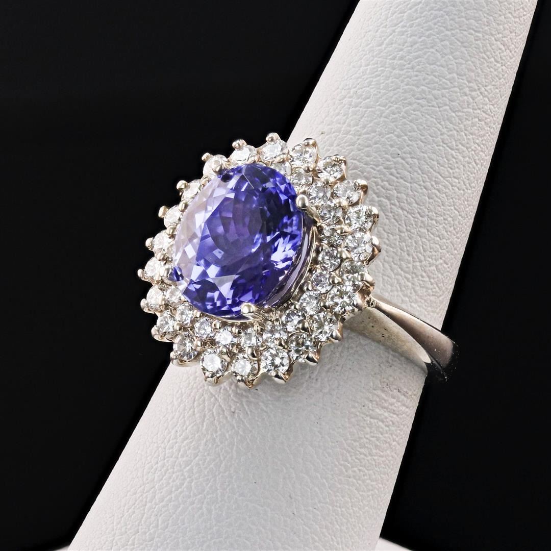 6.06ct Tanzanite and 1.24ctw Diamond 14K White Gold Ring. One polished, stamped, and tested 14K white gold ring with a bright finish. The ring is mounted with: 1 genuine tanzanite center stone weighing approximately 6.06 carat, and 44 genuine round diamonds weighing approximately 1.24 carats. This item weighs 9.2 grams, condition is new, excellent workmanship. MAIN GEMSTONE3 Species: Zoisite Variety: Tanzanite Shape: Oval Cutting Style: Brilliant Cut Crown, Modified Brilliant Cut Pavilion Measurements: 11.2 x 9.3 x 7.8mm Weight: 6.06 carat Color: Violetish Blue Transparency: Transparent Cut Grade: Very Good Refractive Index: 1.691 - 1.700 DR Birefringence: 0.008 - 0.013 Hardness: 6.5 - 7 ADJACENT GEMSTONES ON RING Identity: Natural Diamond Shape: Round Cutting Style: Brilliant Cut Quantity: 44 Diamonds Measurements: 1.7 - 2.0mm Total Weight: 1.24 carats Clarity Grade: VS1 - SI1 Color Grade: G - H Refractive Index: 2.417 Hardness: 10 TANZANITE WEIGHT: 6.06 ct TOTAL DIAMOND WEIGHT: 1.24 cts WEIGHT OF ITEM: 9.2 grams GOLD CONTENT: 14K White Gold