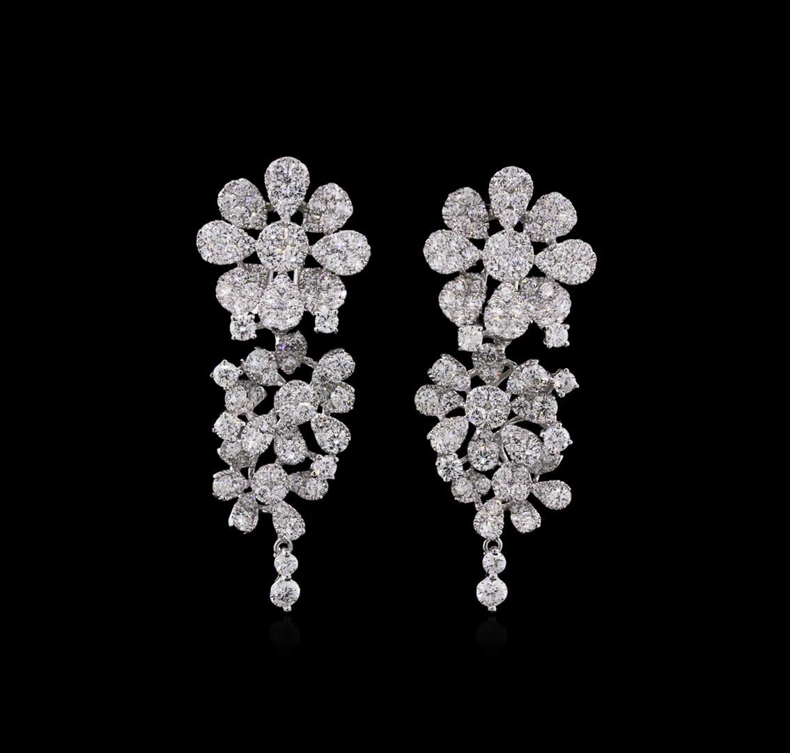 One pair electronically tested 18KT white gold lady's combination cast & assembled dangle earrings with Omega clip backs with posts with a bright polish finish. Trademark is Simon G. Identified with markings of "750". Condition is new, good workmanship. Containing: Three Hundred Thirty-Two prong set round brilliant cut diamonds, measuring 2.90 - 1.00 x 1.17mm (depth est.) approximate total weight of 332 Stones = 6.06ct. Graded in the setting. Clarity: VS-1 to VS-2. Color: G - I. Cut Very Good. Total Weight of Diamonds 6.06ct. Total Weight of Earrings 11.50gm. GAS Appraised at $28,110.00.