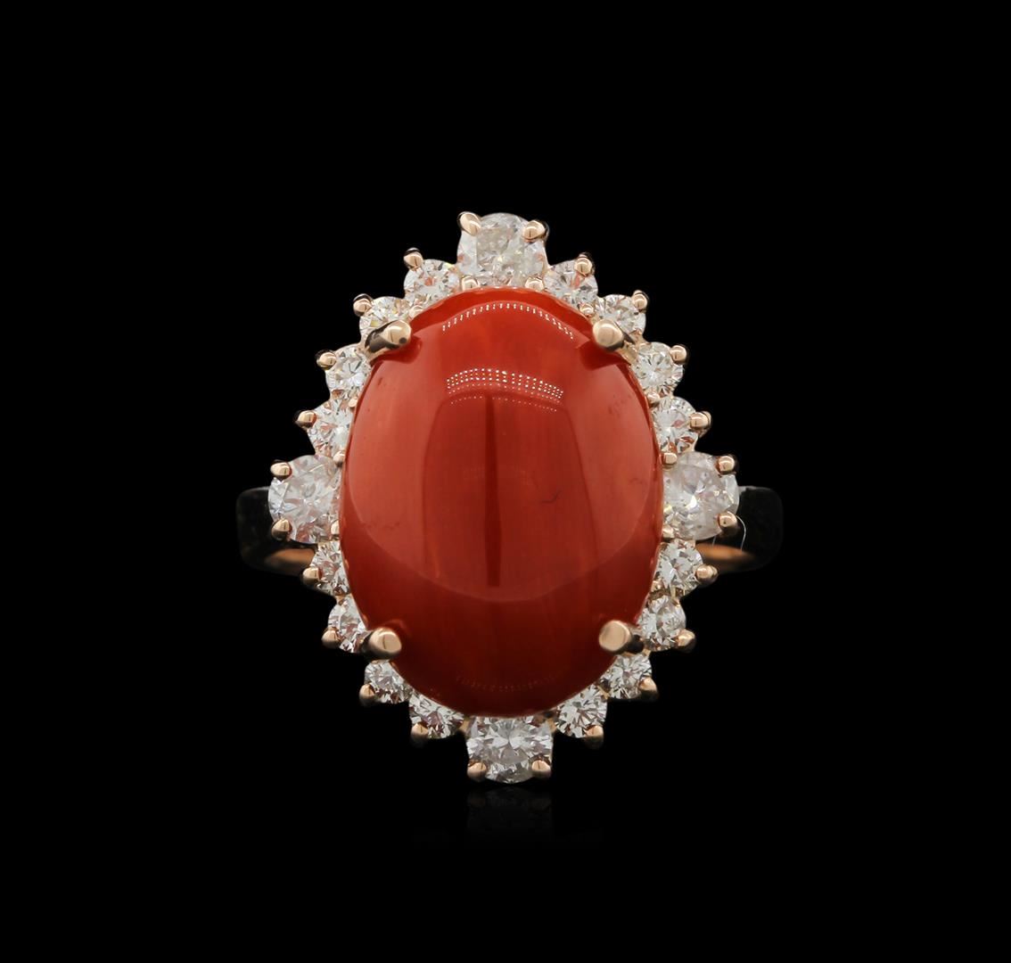 One electronically tested 14KT rose gold ladies cast coral and diamond ring with a bright polish finish. The featured coral is set within a diamond bezel, completed by a three millimeter wide band. Identified with markings of "K14". Condition is new, good workmanship. Containing: One prong set oval cabochon cut natural red coral approximate weight of 6.09ct., dark, very slightly brownish, orangy red color, (GIA oR 7/3), cut is good. Transmitting light very diffusely, opaque. Naturally occurring internal & external characteristics are present. Graded in the setting. Red Coral (Corallium Japonicum) is formed undersea by microscopic animals called coral polyps. These tiny, creatures form minute, hard shells. As a colony grows, it takes on complex branching, tree-like forms which allows the maximum number of polyps to be fed by the nutrients in the water. It grows about one quarter inch per year. This color of coral is commonly treated to improve or change the color and stability. Evidence that may confirm this is typically lacking. Twenty prong set rose cut diamonds approximate total weight of 20 Stones = 0.98ct. Graded in the setting. Clarity SI-1 to I-1 Color H - J. Total Weight of Colored Stones 6.09ct. Total Weight of Diamonds 0.98ct. Total Weight of Ring 7.38 grams. AIG Appraised at $4,435.00.